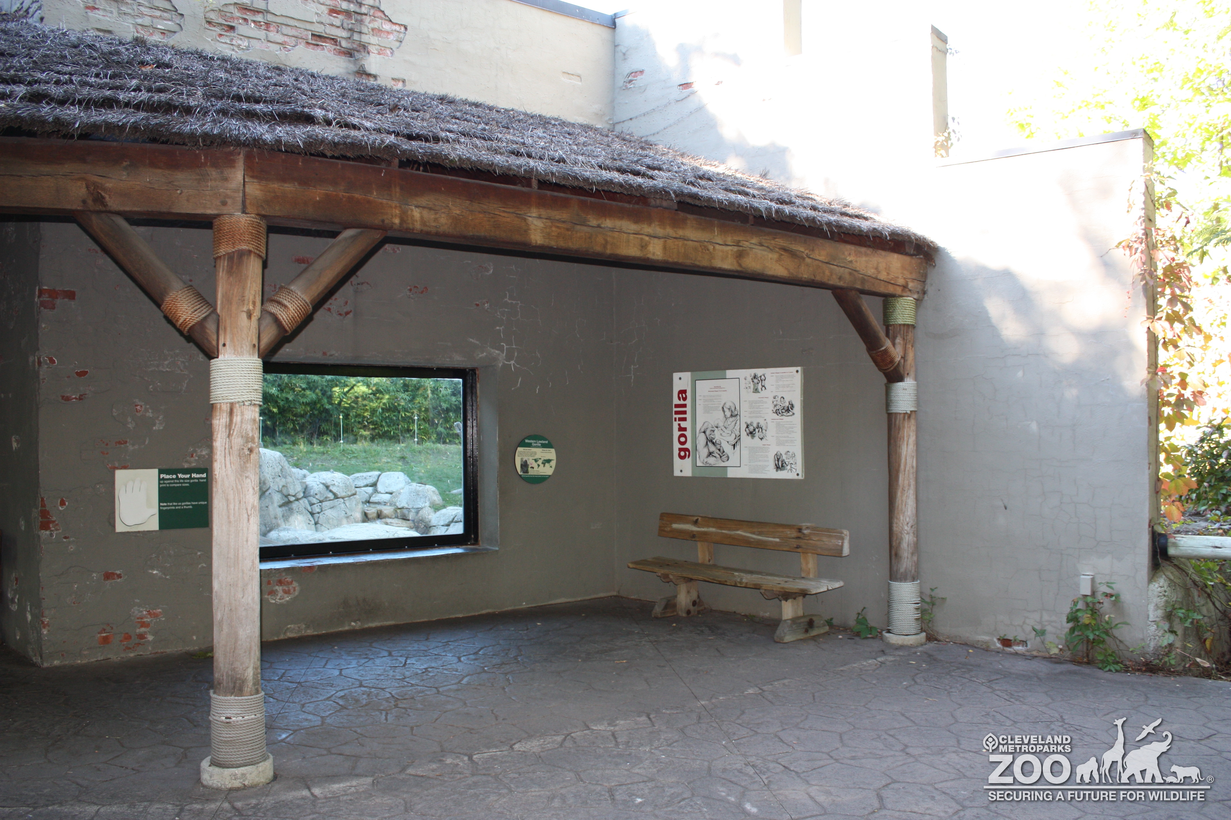 Outdoor gorilla habitat. Located behind the Primate, Cat & Aquatics building. Thatched wood structure overhanging a glass viewing window. Gorilla graphics are on the walls. Wood bench is available for visitors to sit and watch.