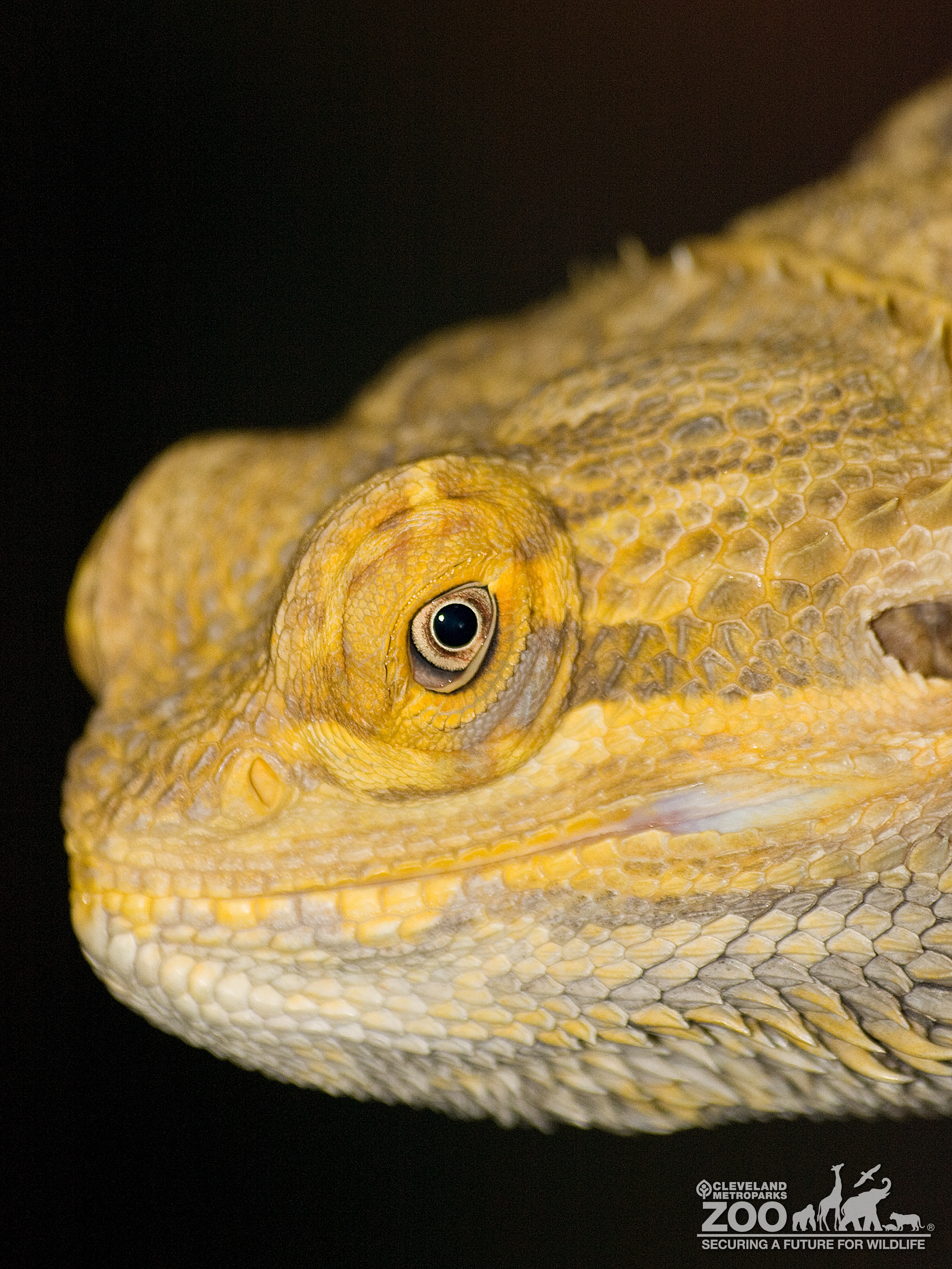 Close up of bearded dragon's head in profile facing left. The bearded dragon has small spikes protruding around the neck area and is in shades of yellow and brown. The eyes on the sides of its head are gold in color, while the breaded dragon also has a hole on either side of its head for ears.
