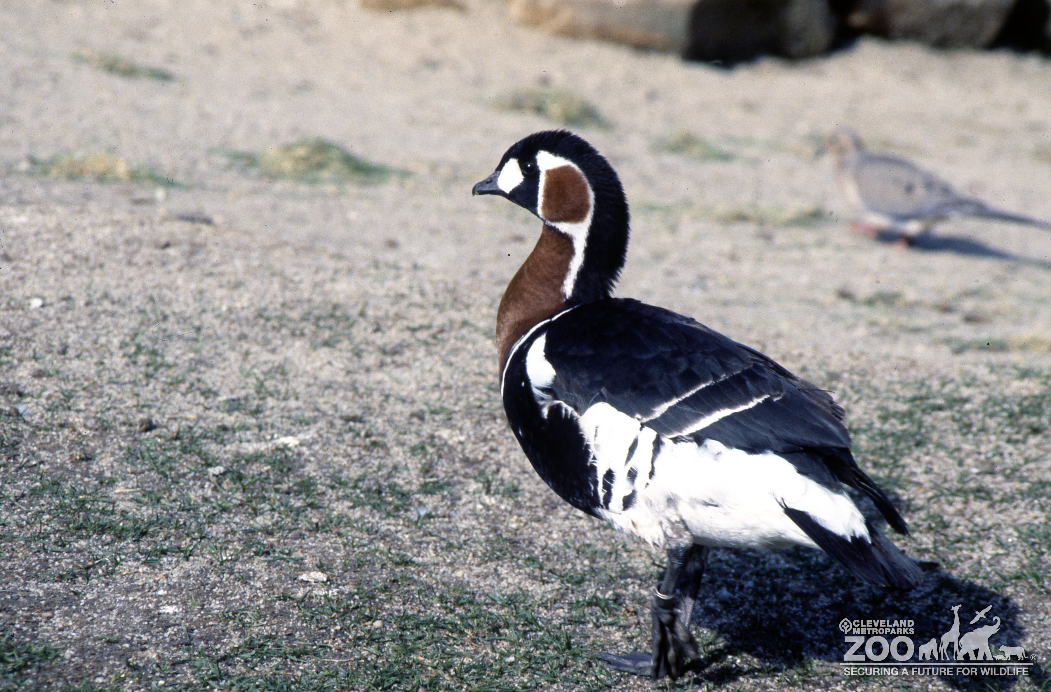 Red-breasted goose side view outside in exhibit yard. Feathers are black, white and reddish brown.