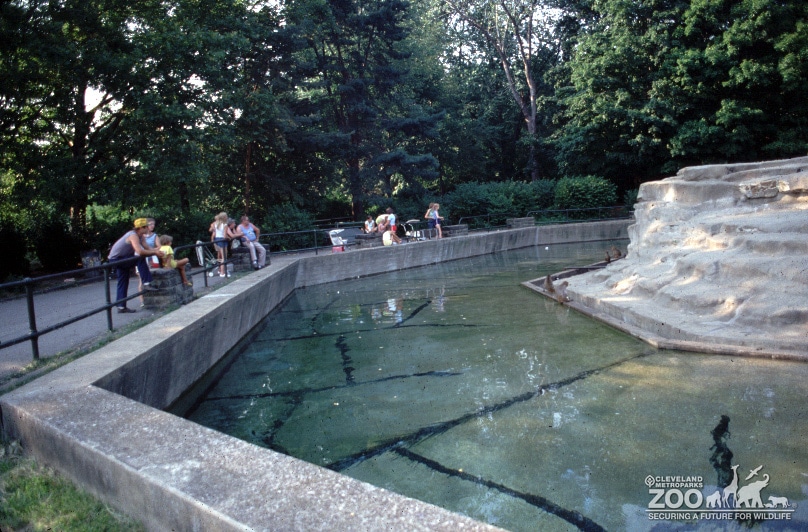 Gray Monkey Island protrudes from right side of photo and two monkeys just visible sitting near the clear blue and green moat. Several visitors line the black railing separating the viewing area from the cement-walled moat.