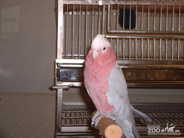 The parrot is white and its breast is pale pink. It is sitting on a round wooden perch outside of its its metal cage.