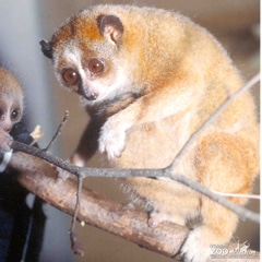 Lesser (pygmy) slow loris is sitting on a branch. This small fur covered animal has large round eyes. Its fur is gold in color.
