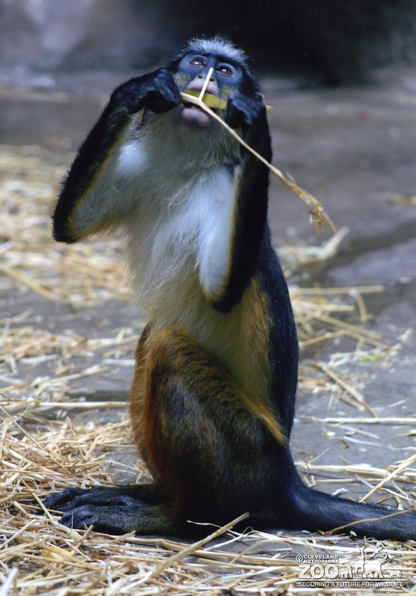 Wolf's Guenon munching on food. It is sitting in the exhibit. This is a smaller primate.