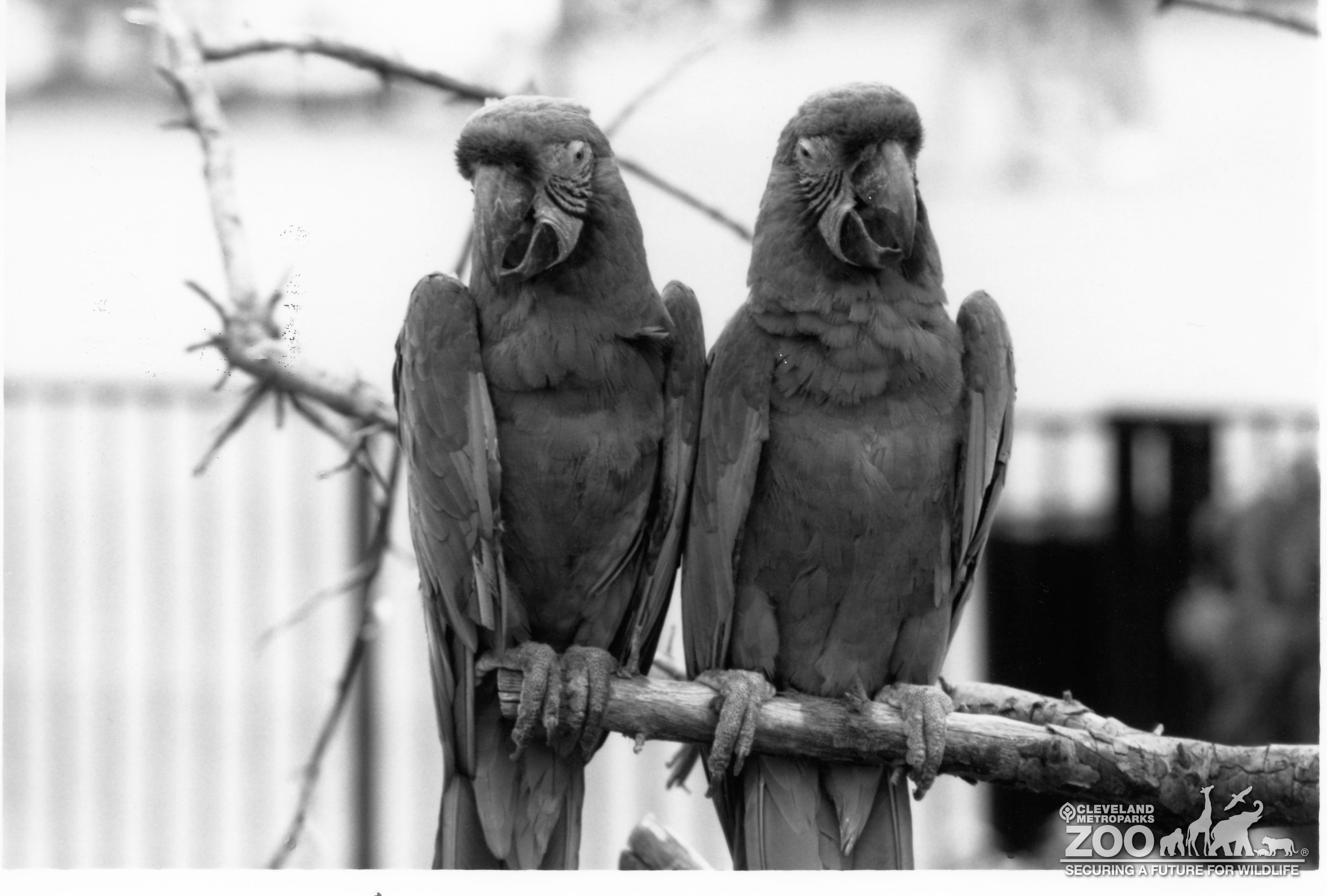 Pair of scarlet macaws in black and white image. Birds are perched together on a branch. They are facing forward but one's head is turned slightly to your left.