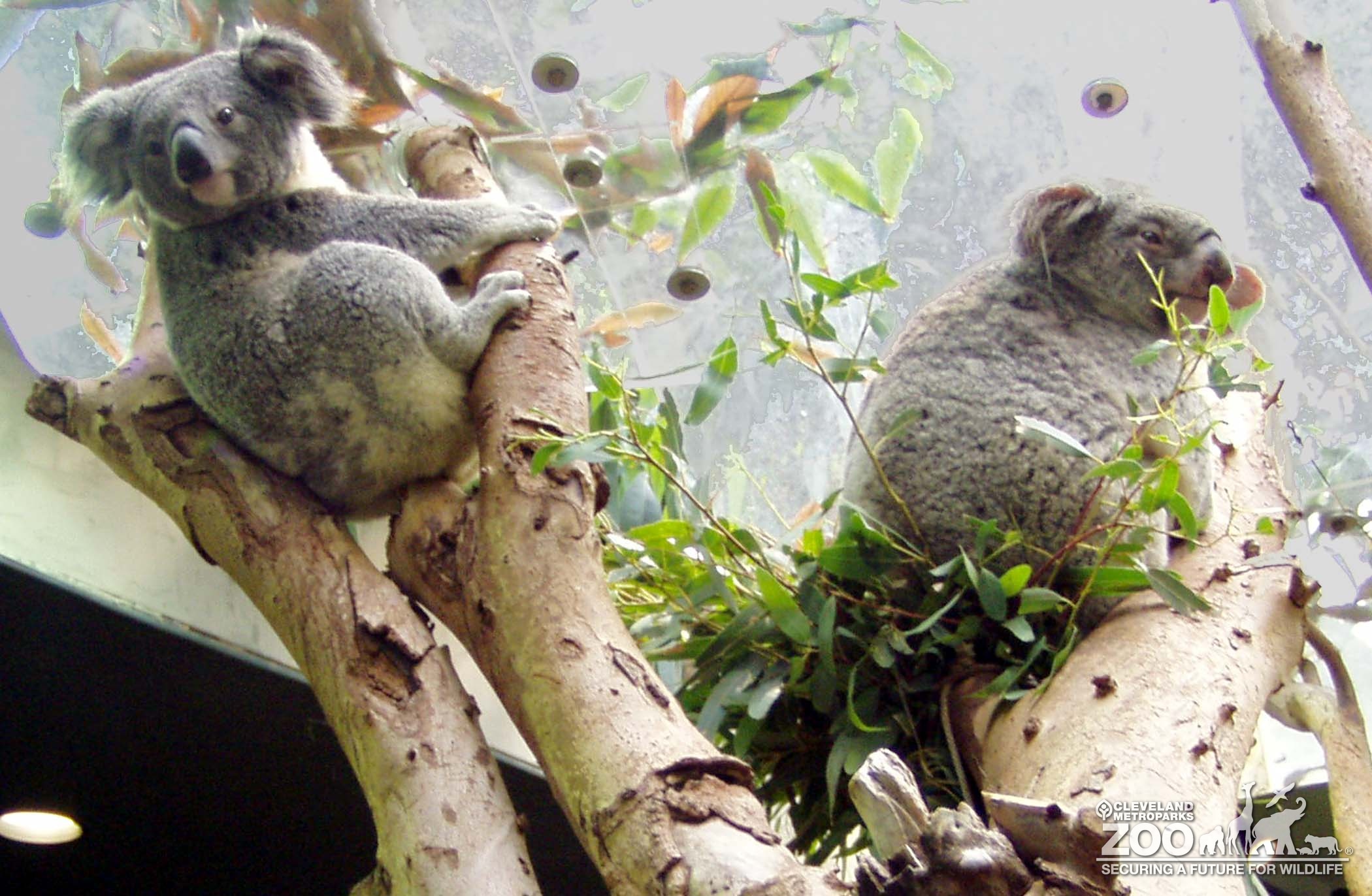 Pair of koalas in exhibit tree. Each is looking in a different way. Camera is shooting up at the koala.