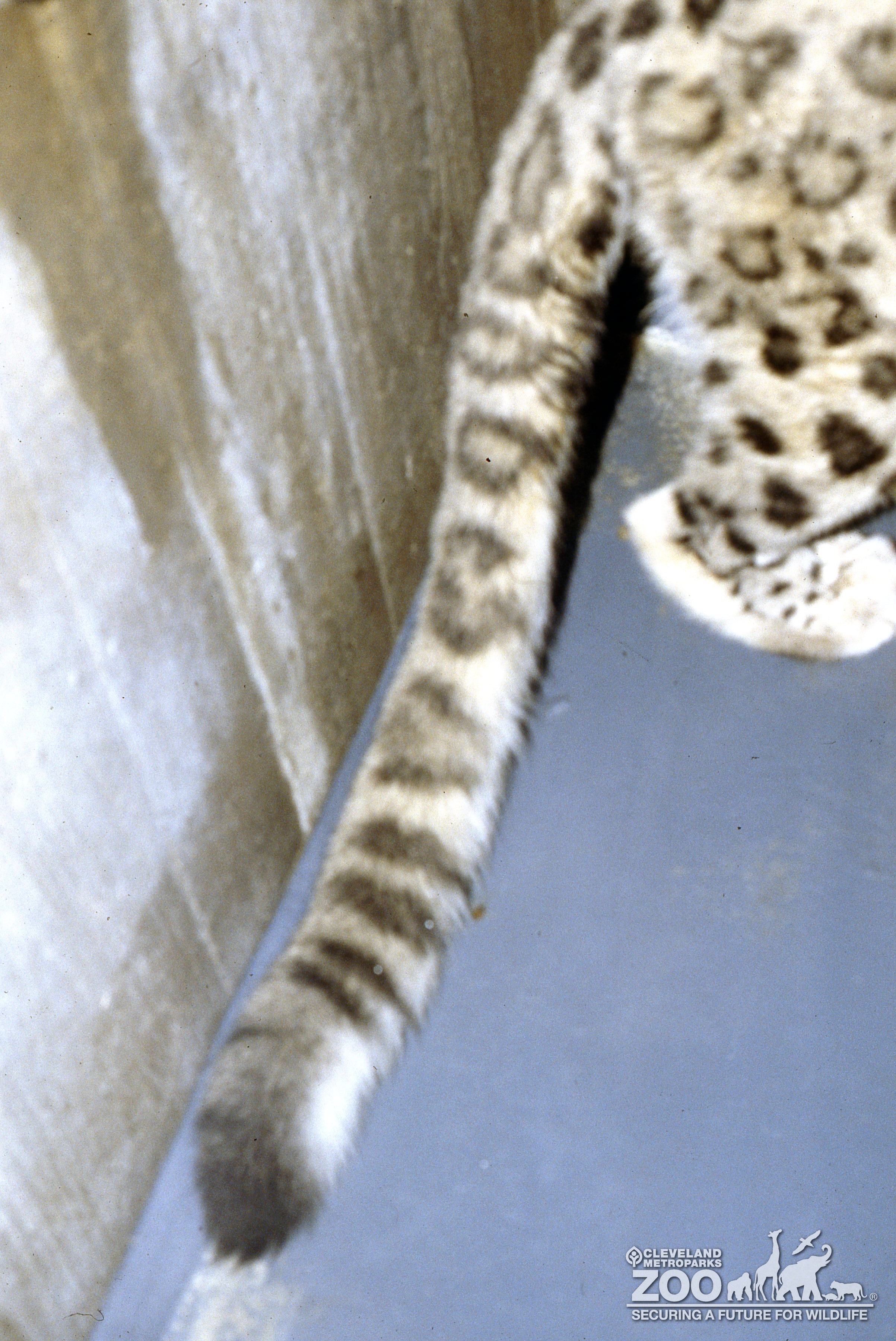 Blurry image of Snow leopard tail. Only the tail and part of a leg is in image.