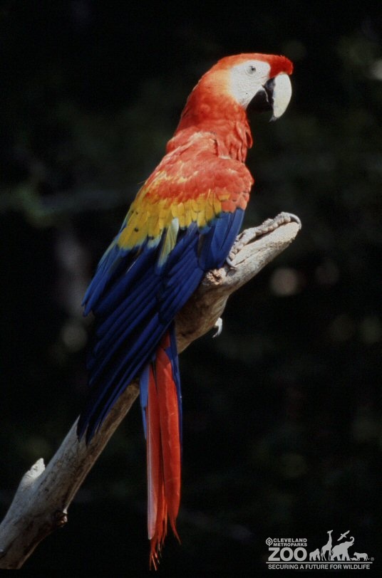 Scarlet macaw perched on a branch looking to your right. This colorful bird has feathers of blue, red and yellow. Beak and eye patch is white.