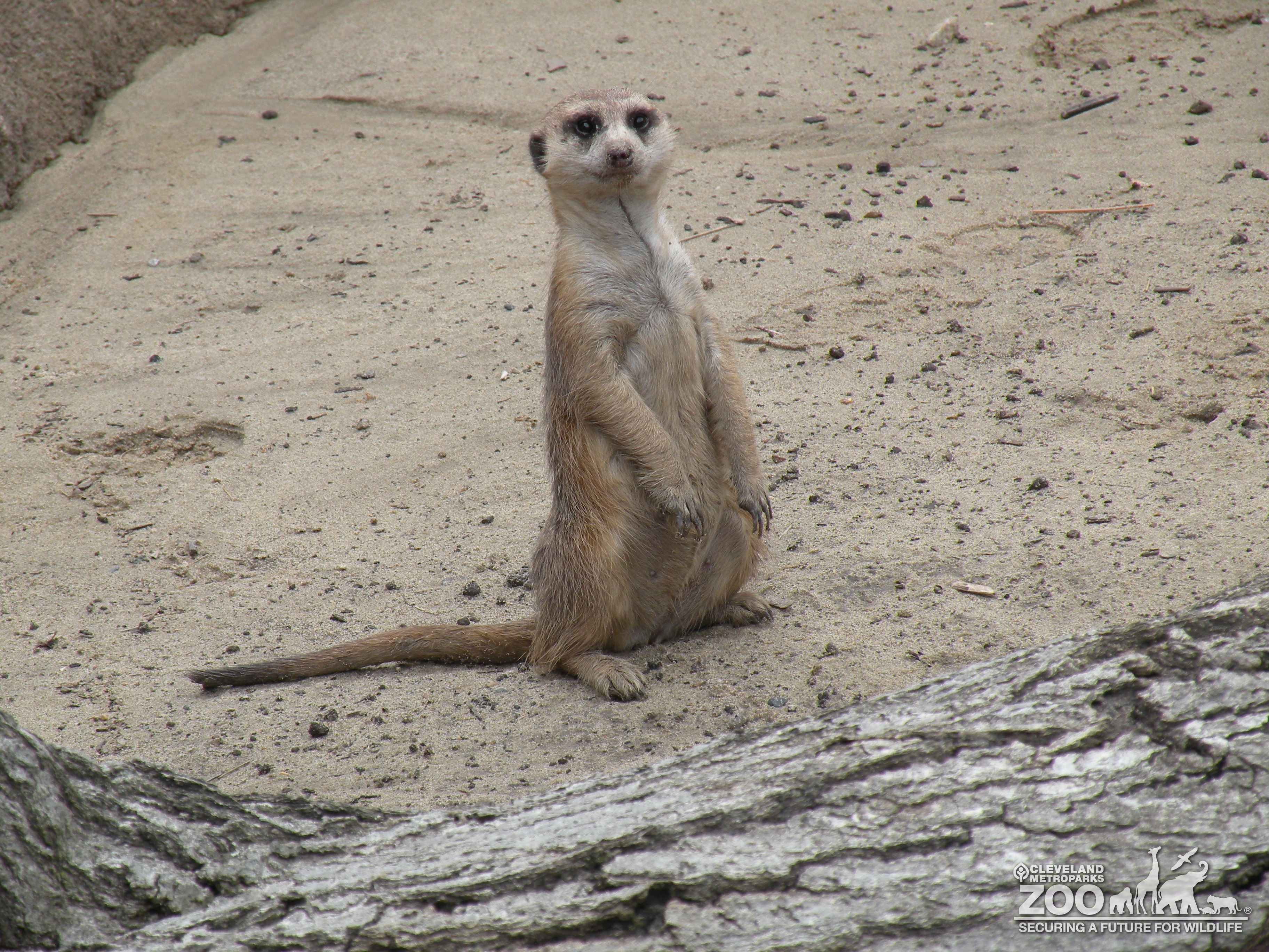 Meerkat sitting upright on the look out. Animal is outside in its habitat. Meerkats are a little large than squirrels but slimmer. Their tails are long and fur covered and not bushy like a squirrels.
