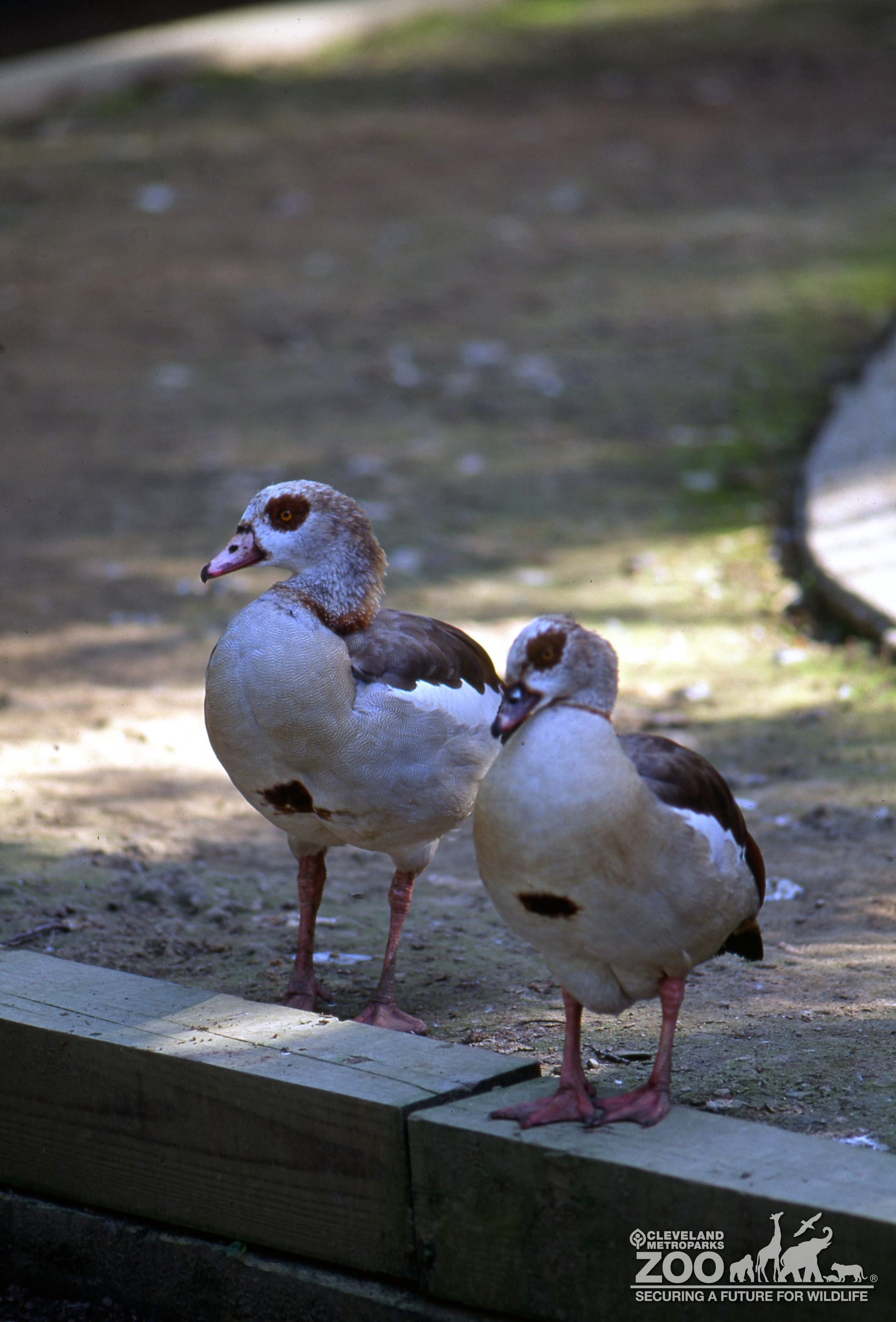 Pair of Egyptian geese standing outside in an exhibit yard. The geese are looking to the right and are in shadows. There feather colors are muted. Background is blurred focus is on the pair.
