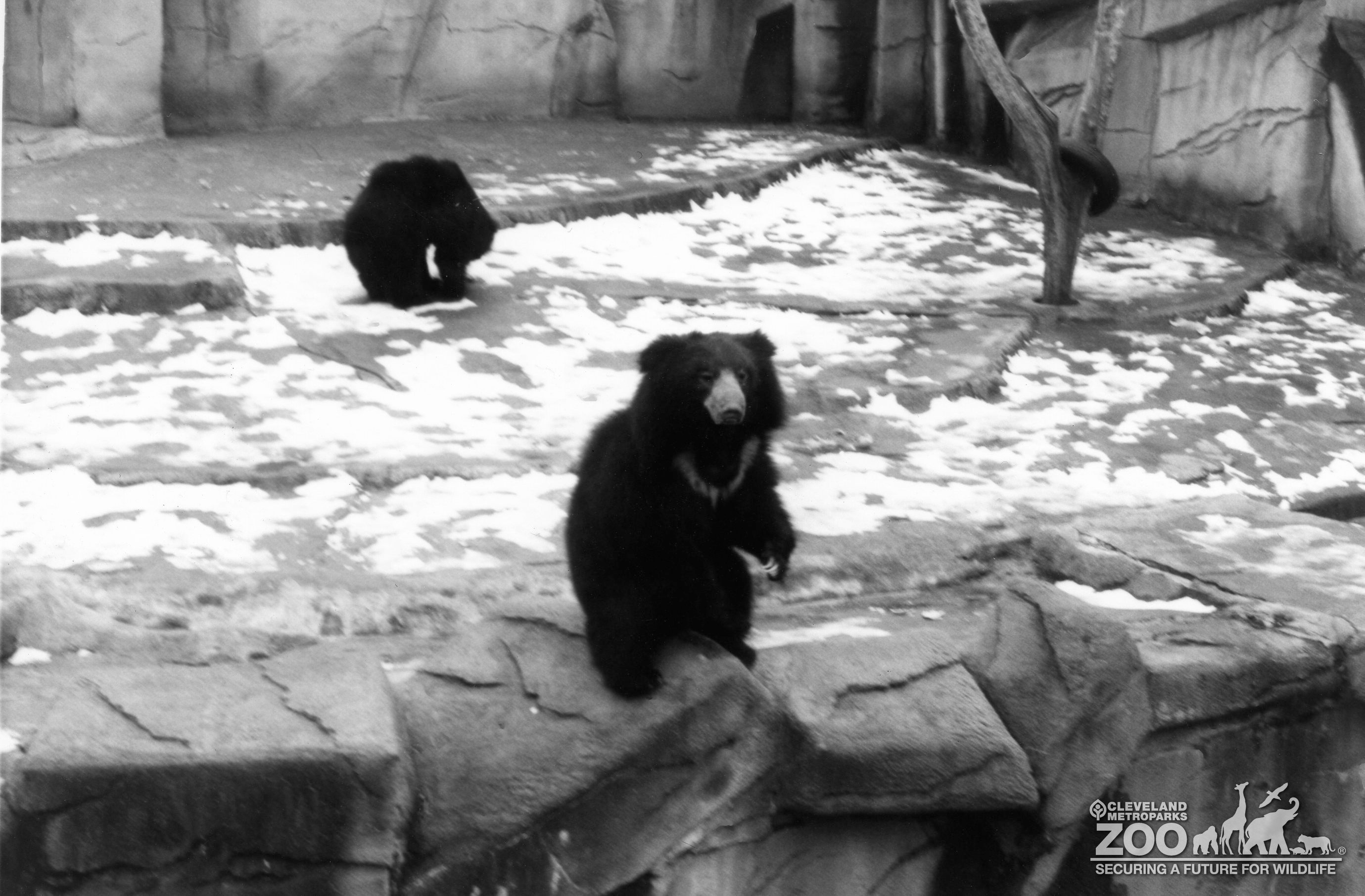 This is a black and white photo of two Sloth Bears standing in their outdoor enclosure. The bear closest to the camera is standing on its hind legs on the cliff edge of the trench looking up at the camera. The other bear is standing in the background looking down, sniffing the snowy white ground. Both bears are covered with long black fur with light brown fur on their muzzles and a single stripe across their chests.