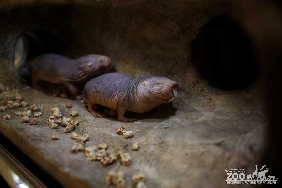 Two naked mole-rats emerging from a tube into a chamber. These rodents live underground in groups similar to how ants live. They are hairless and wrinkly.