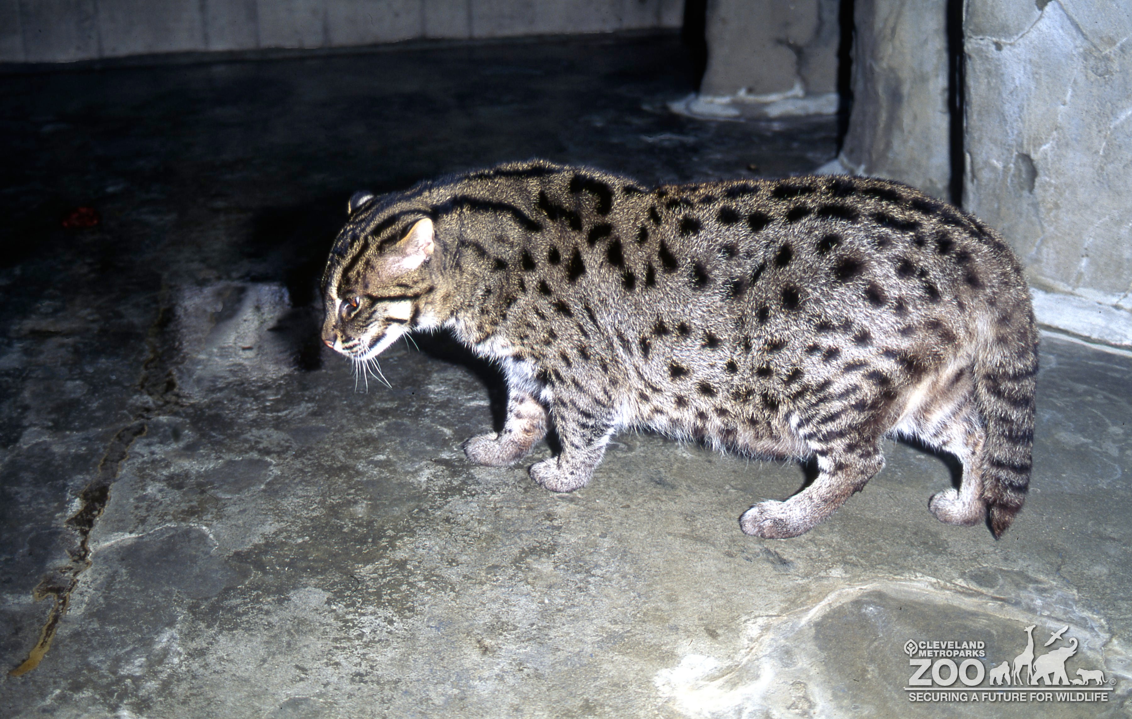 Close up view of Fishing Cat in a crouching position. It has black spots on it's body.