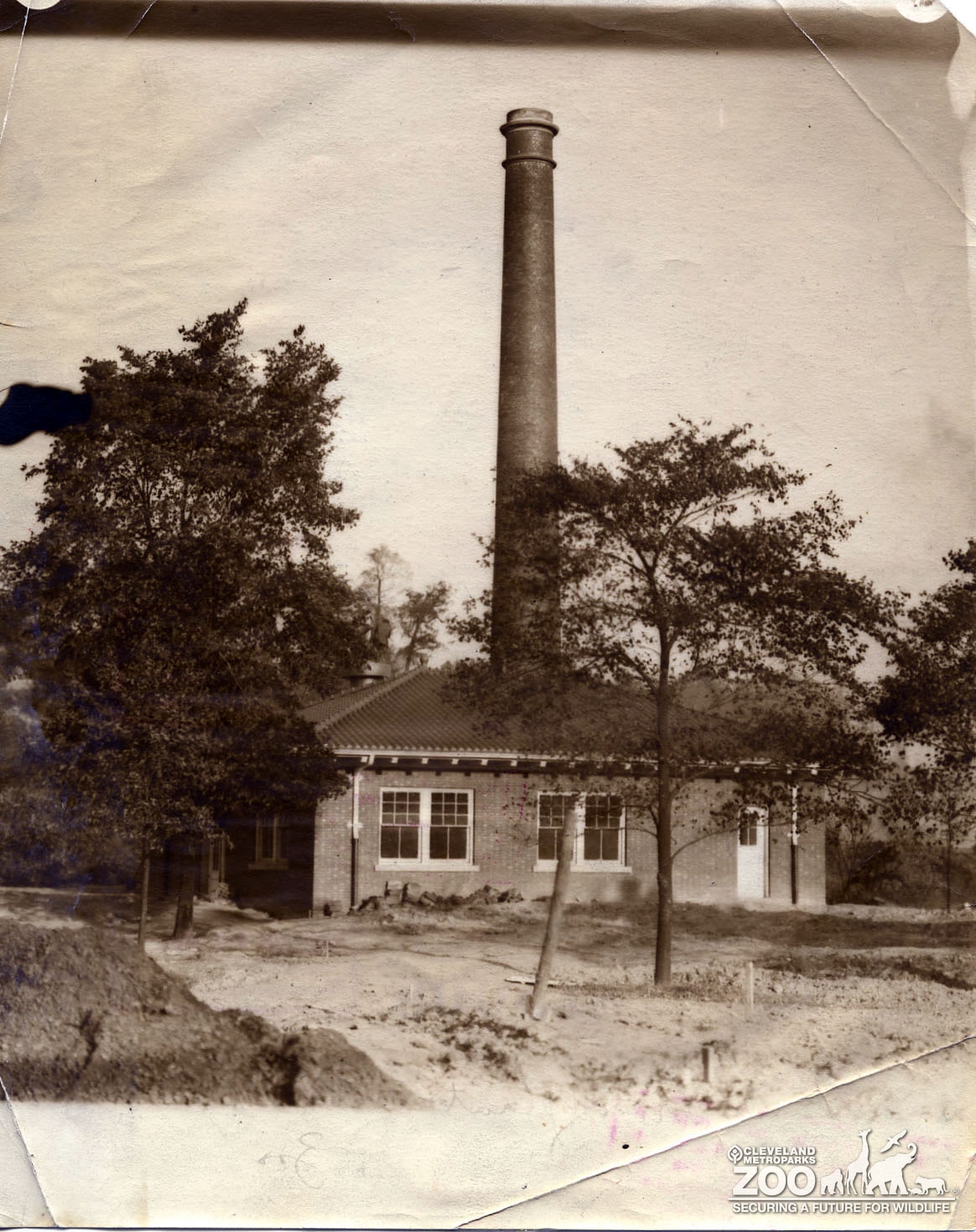 The Brookside Power Plant sits on a site near the zoo. The photo is sepia tinted from age and shows a building with a smokestack.