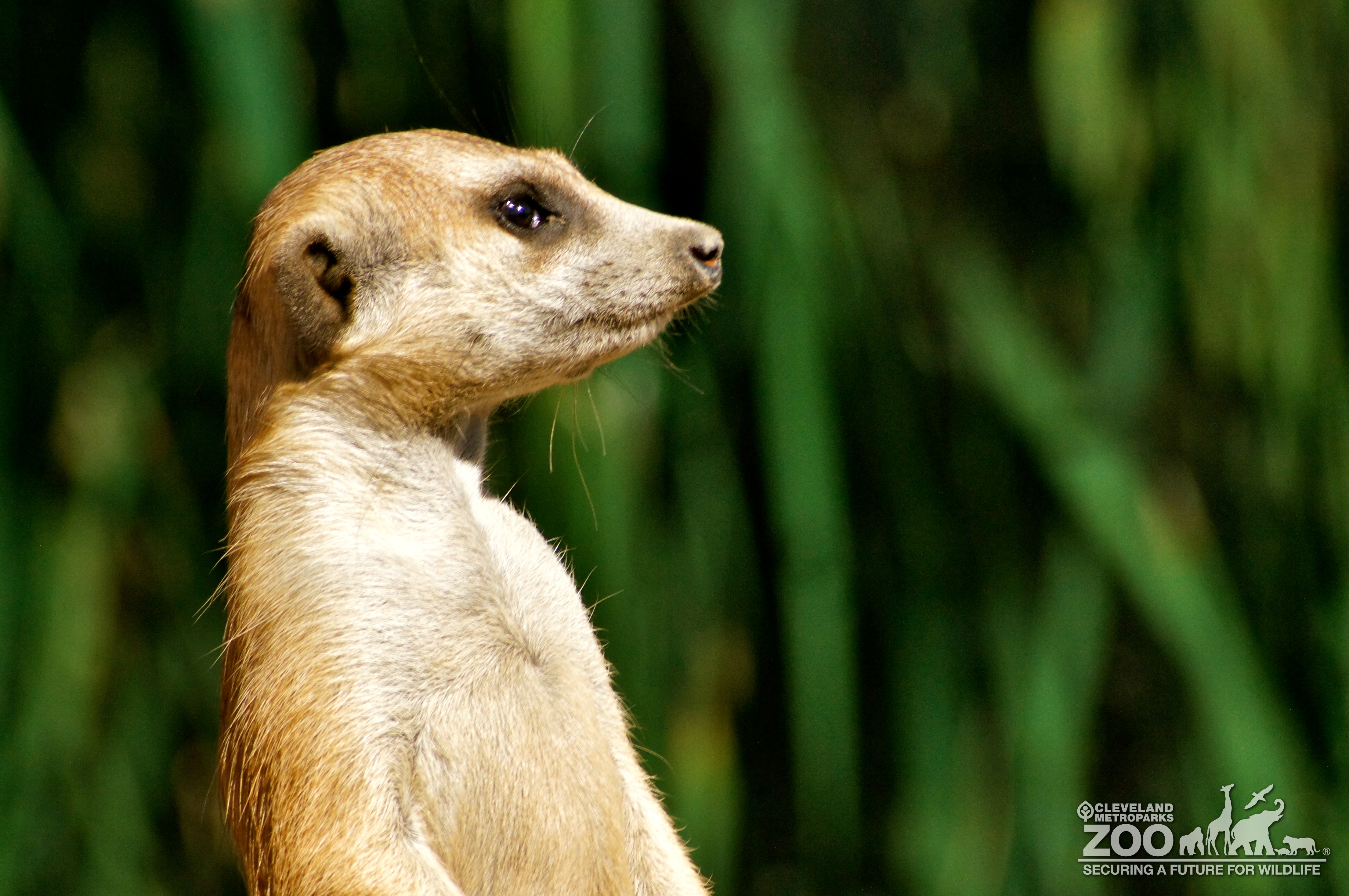 Meerkat facing to your right. The animal is outside in it habitat. Show from the wait up. Blurred green grass is in background.