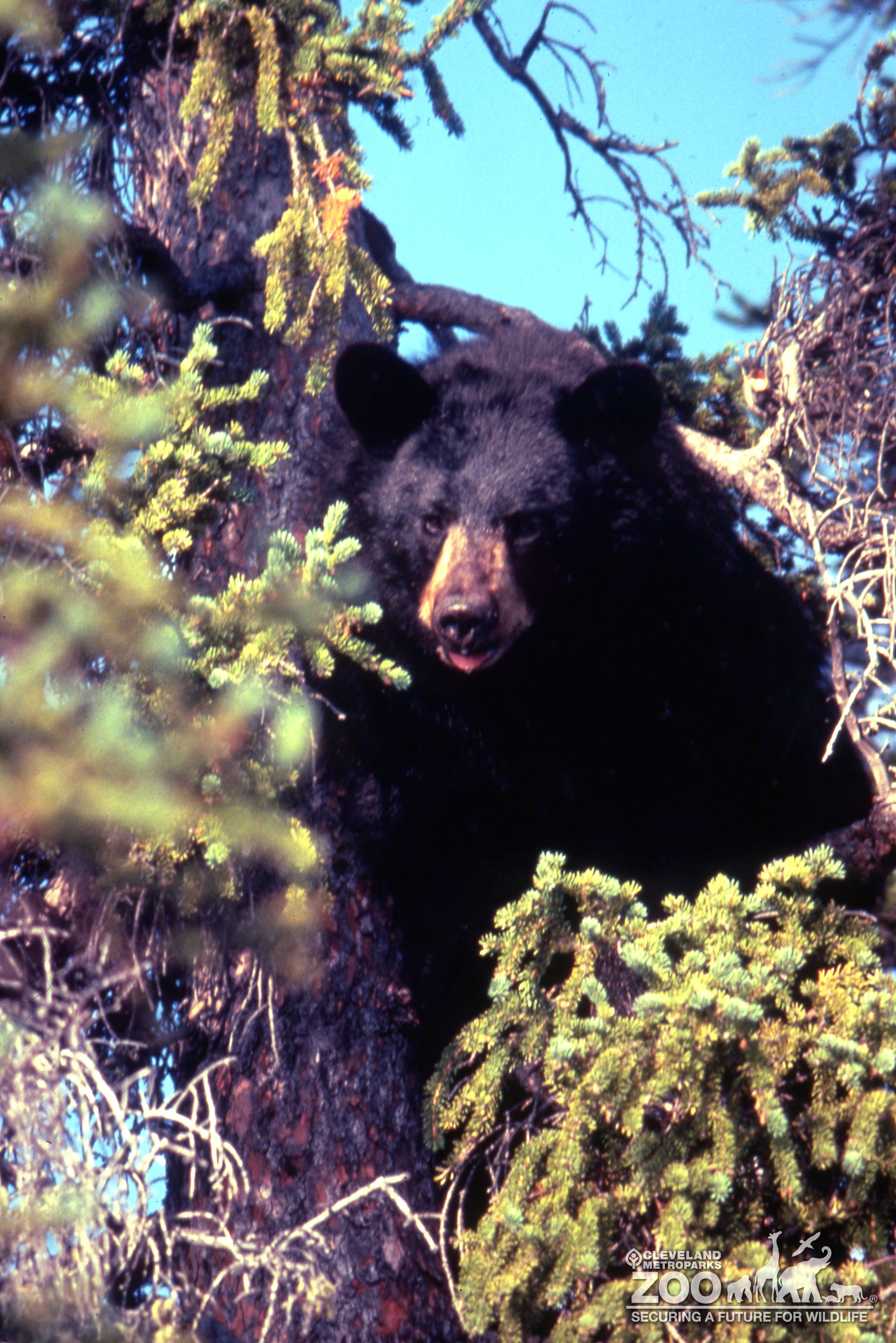 This North American Black Bear is high up in a green pine tree hanging on to the tree trunk. The bear is looking at the camera with it's tongue sticking out slightly. It has big brown eyes and is covered in short black fur with a little bit of light brown fur around it's muzzle.