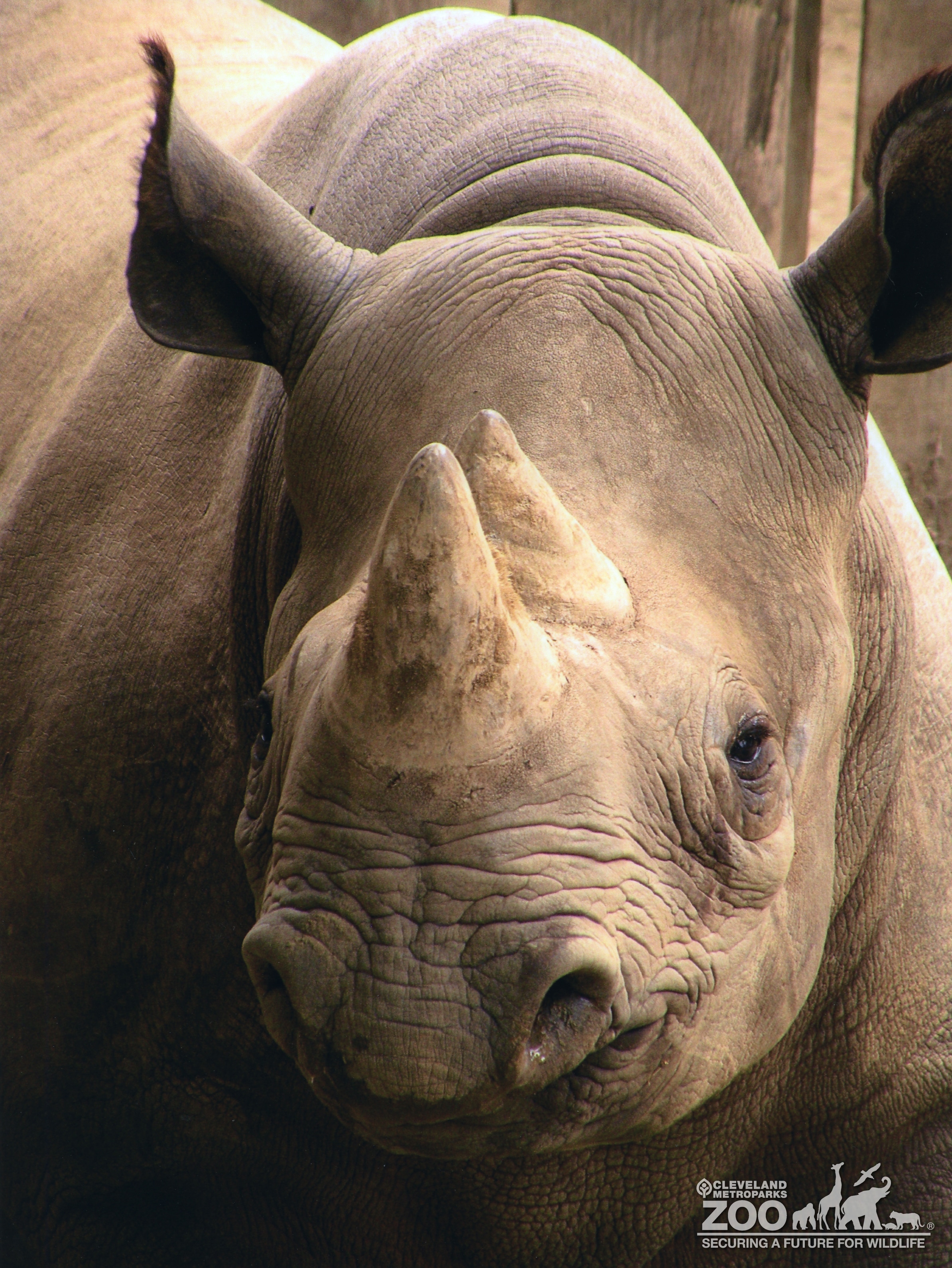 Close up of rhinoceros facing the camera. Left eye visible with right side of head and body in shadow. Front horn in view above nostrils and wrinkles upon face. Smaller horn behind the first half visible with head on view.