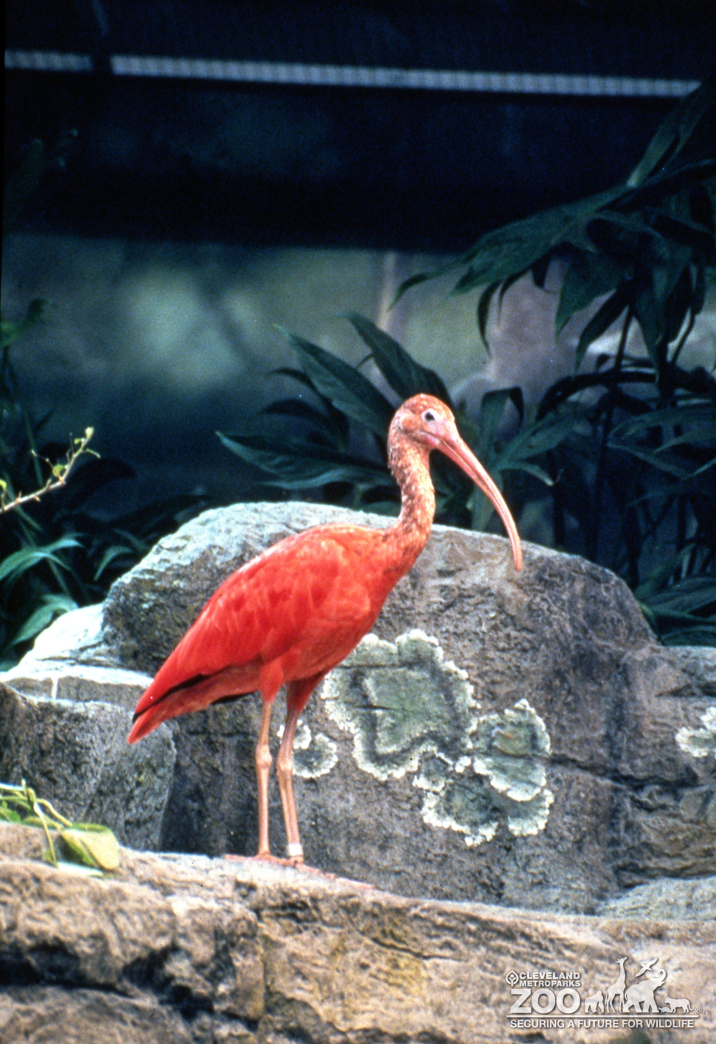 Scarlet ibis standing on a rock inside The RainForest. Bird has bright red feathers on its body. Bill is long and slim.