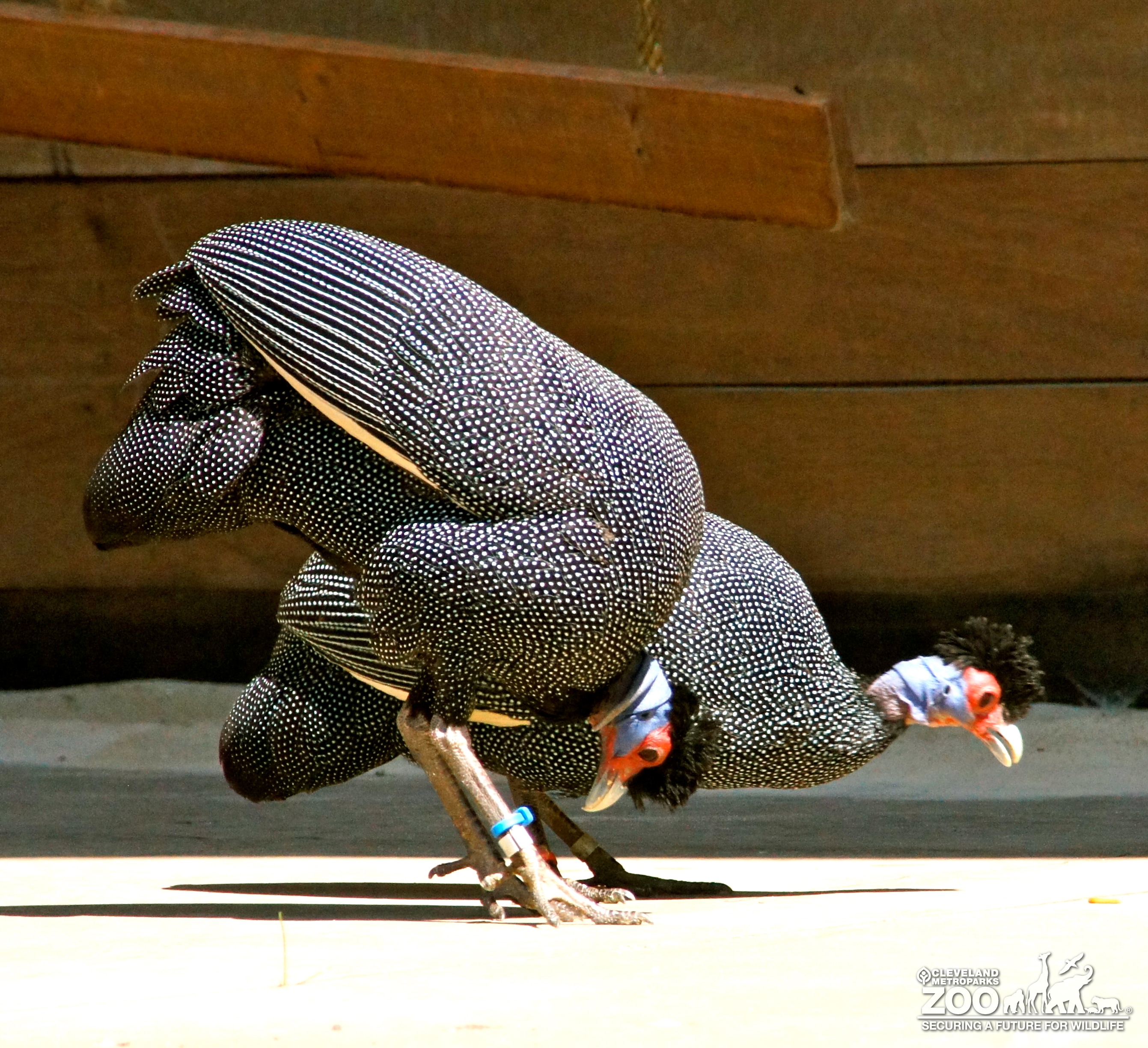 Two eastern crested guineafowl appearing on stage. These birds are the size of a large chicken. They have black body feather with small white dots. Black tuft on their and head. Blue and red markings on face and throat.