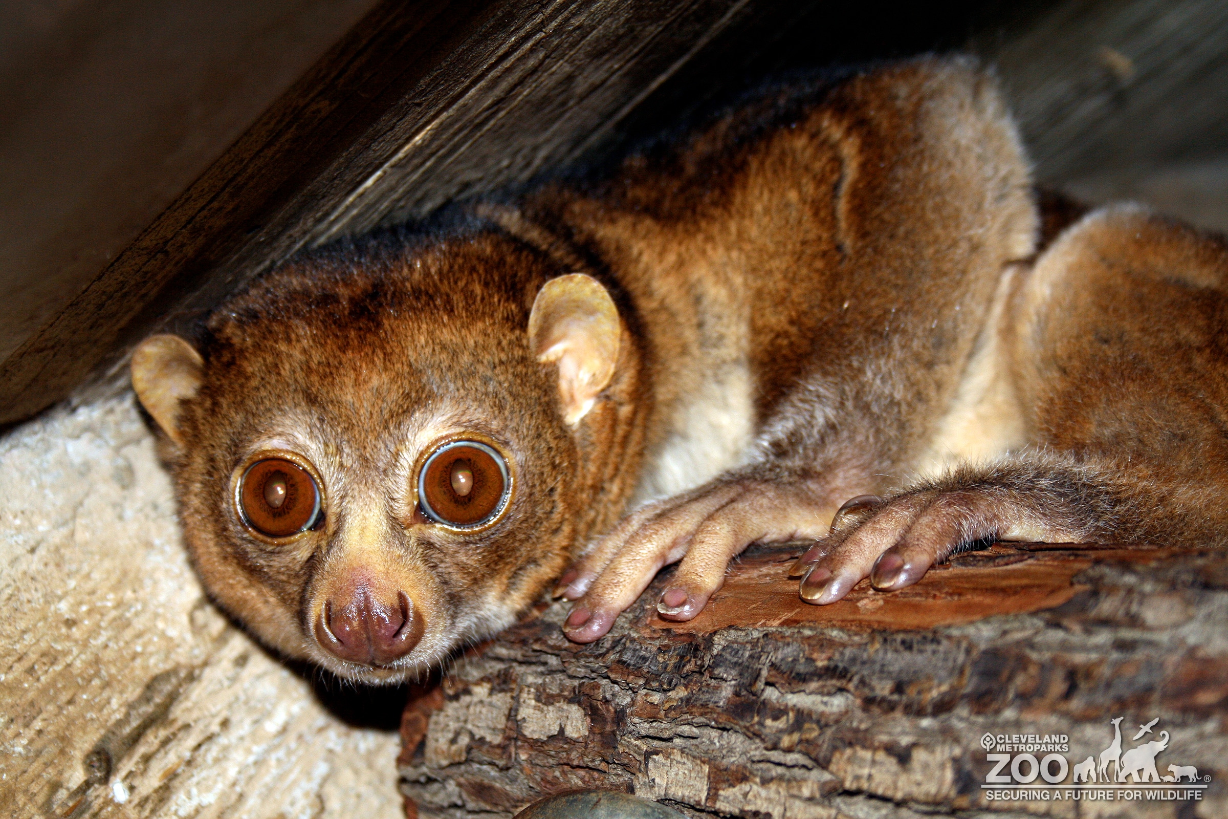 A Bushbaby laying down on a brown log. It is covered in fur in shades of red, brown, white, and beige. The primate has large amber eyes, round ears, and a large brown nose.