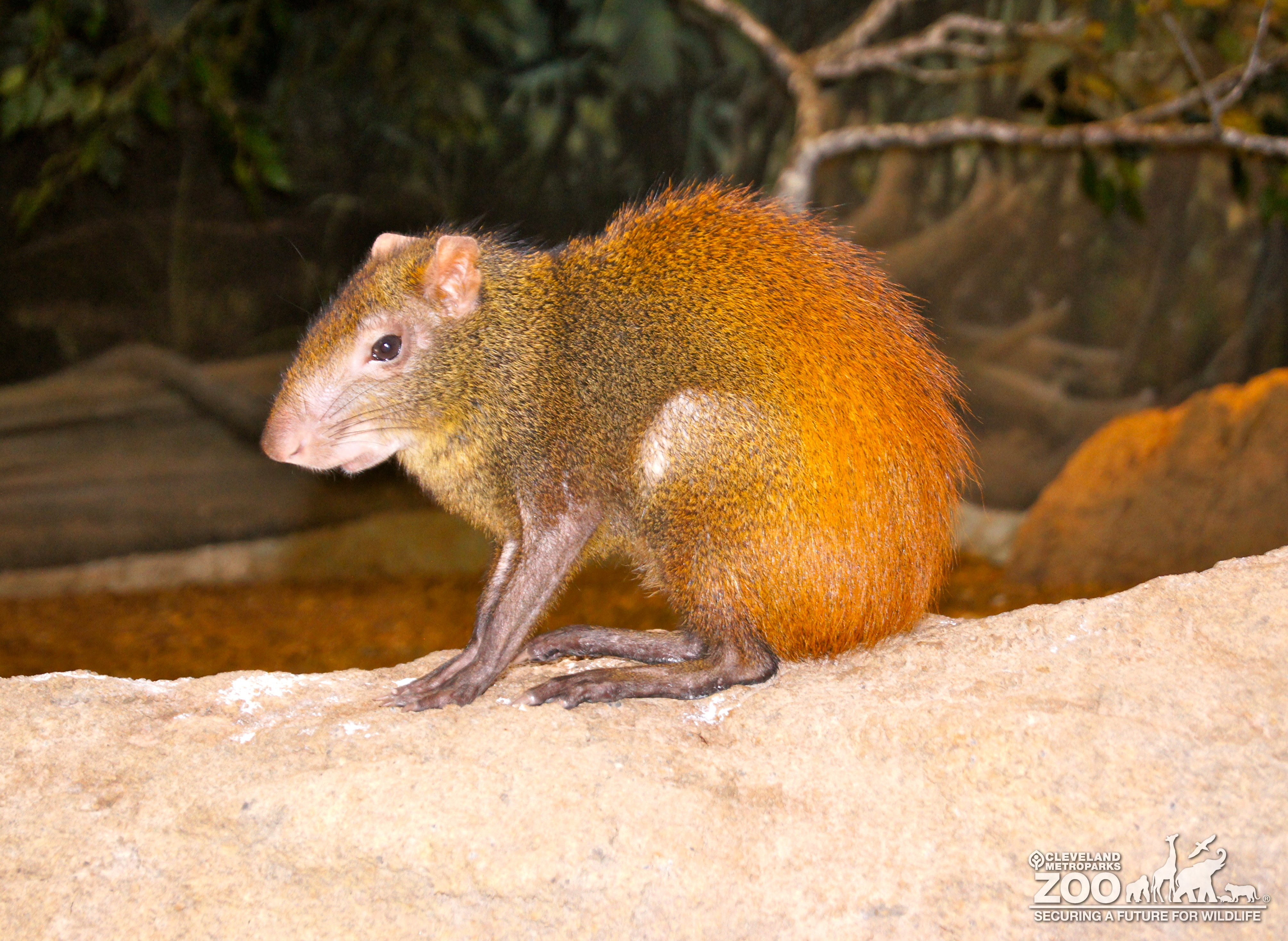 This Red-Rumped Agouti is covered with brown fur around it's head and front legs, but it's fur turns red down it's back and hind legs. It is inside it's enclosure sitting on a large rock with several trees in the background. It looks like a rodent with legs similar to a Kangaroo.