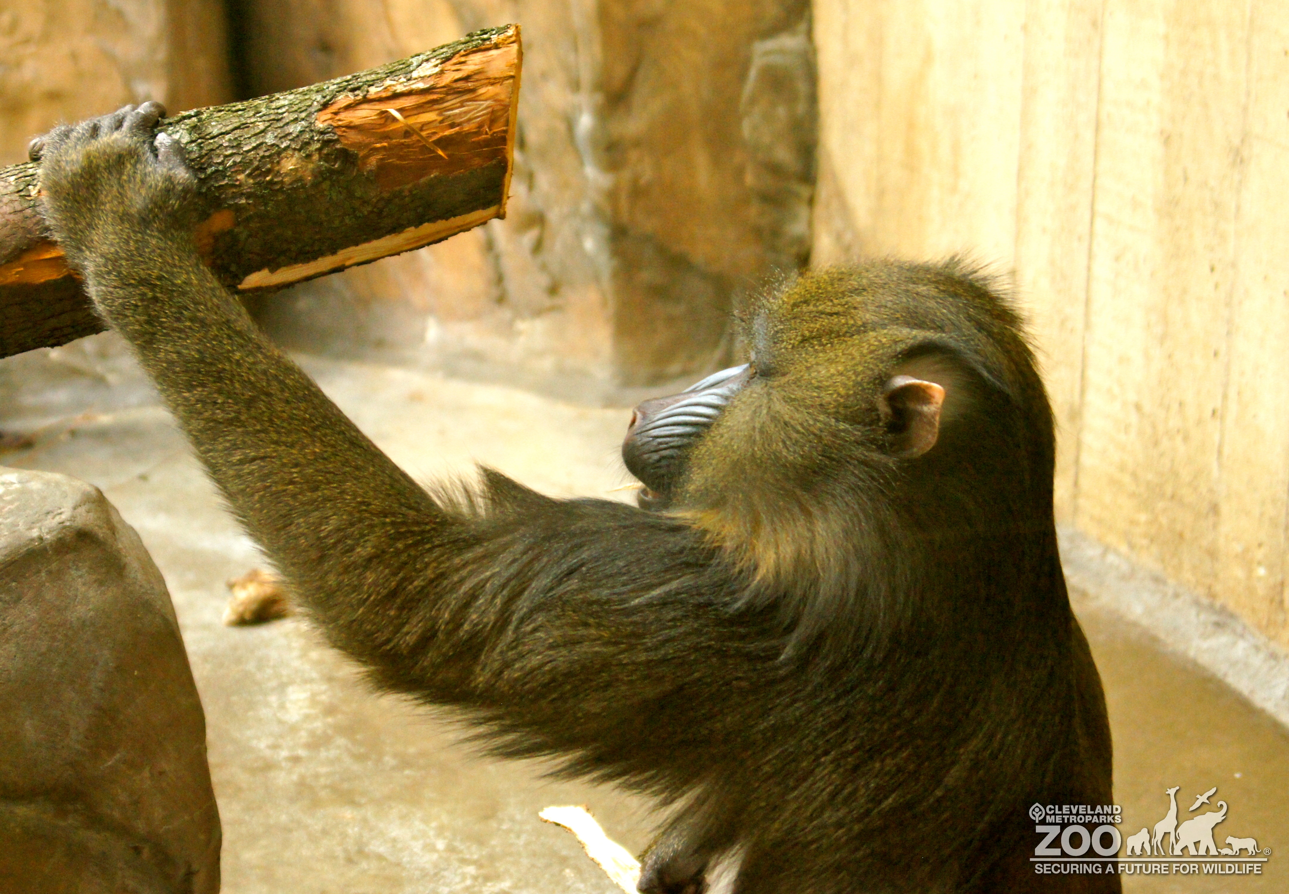 Side view photo shows a Mandarin ripping bark.