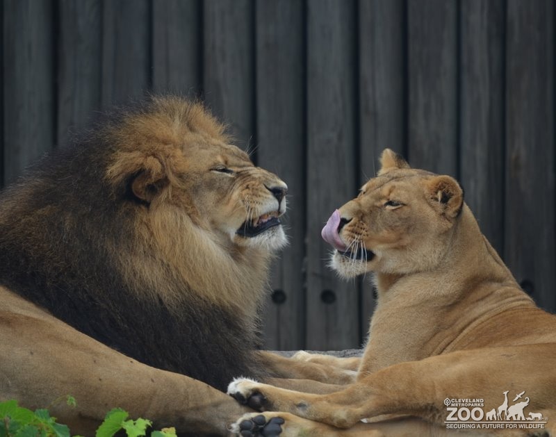 Male lion and lioness facing inward toward one another and laying down. Male lion with shades of brown and black in mane has mouth slightly open and down turned with wrinkled face. Lioness tongue reaching up and over nose.