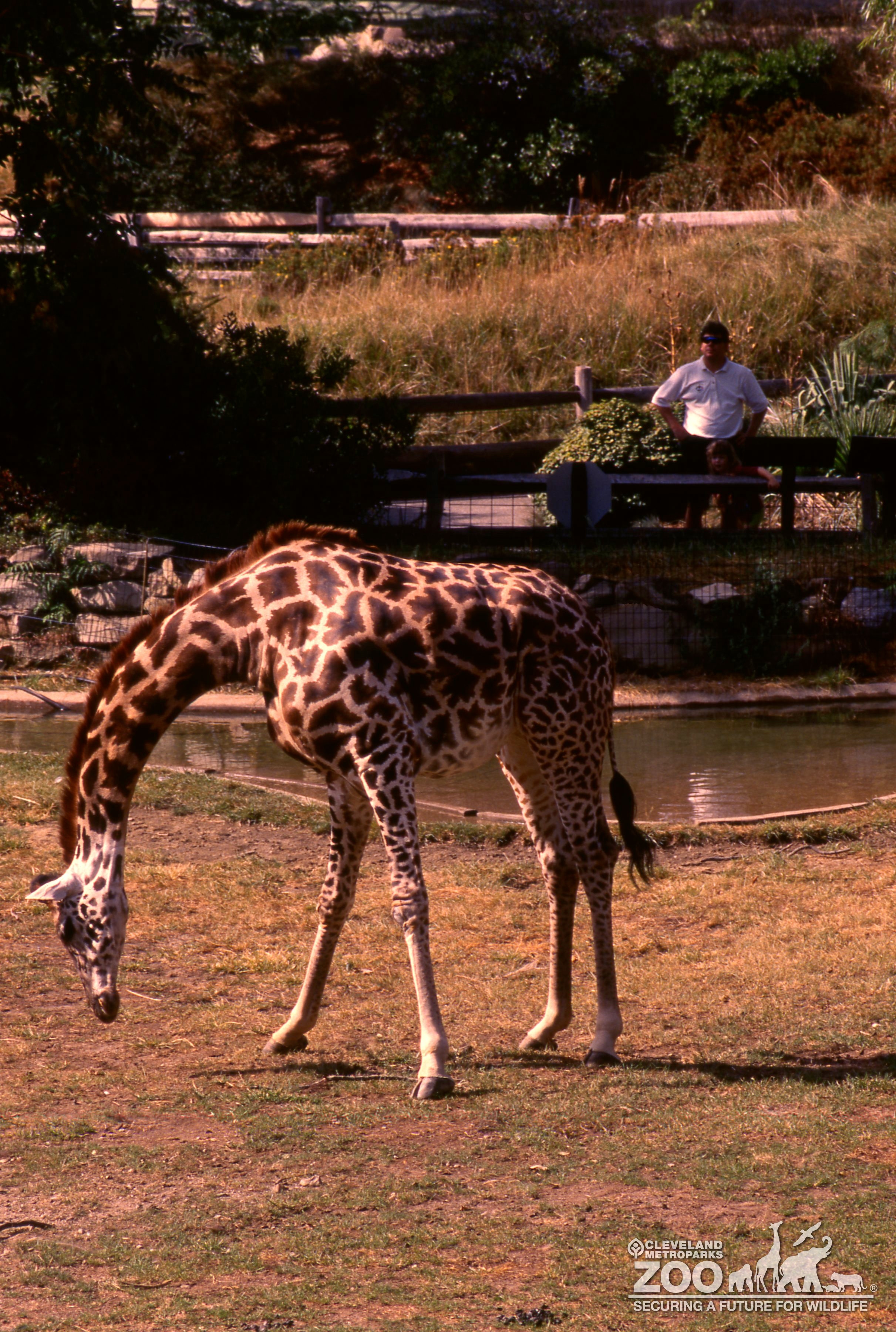 Side view of Masai giraffe outside in African savanna yard. It's bending its long neck eat grass. In the distance, a visitor is watching with his child at a split rail fence.