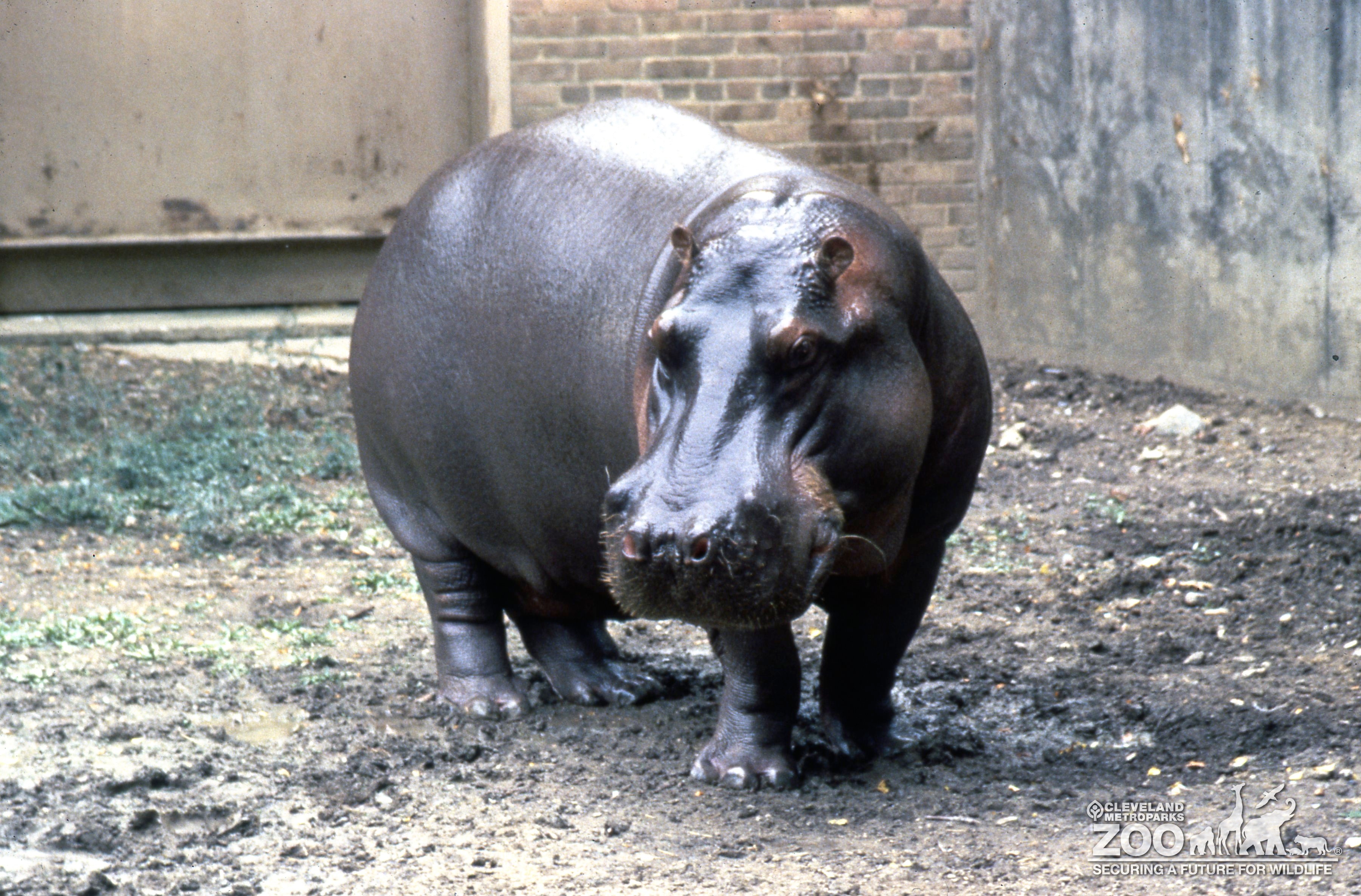 Nile hippo, blackie outside of old pachyderm building. He is looking to the left. Colors are faded to gray in the image.