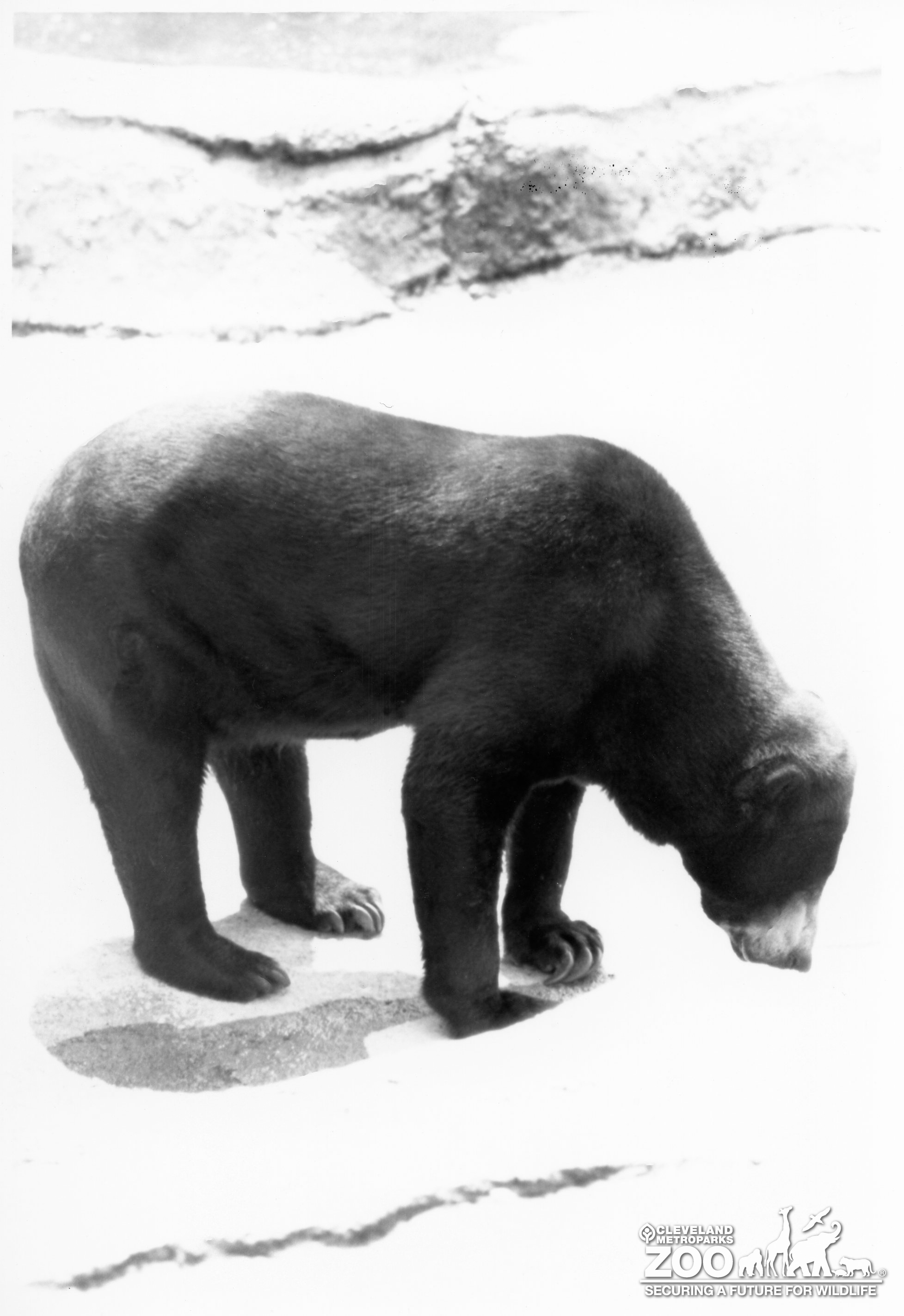 This is a black and white photo of a Malayan Sun Bear standing in it's outdoor enclosure sniffing the ground. The photo shows a clear view of the bear's right side. The bear is covered in short black fur with light brown fur around it's muzzle.