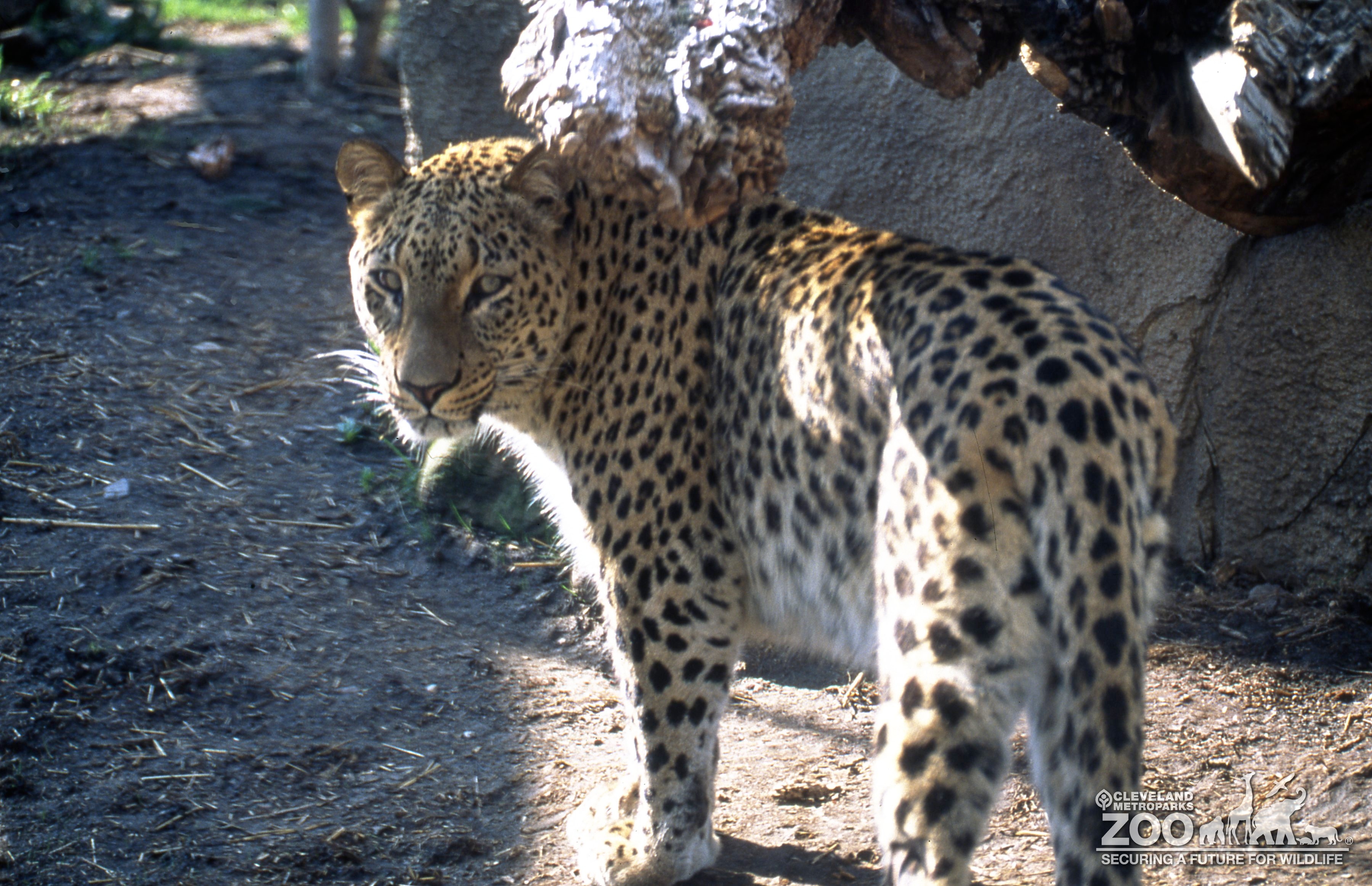 Persian leopard walking away from you with head turned back to get a look. Leopards eyes are looking at you. Animal is in outside habitat.