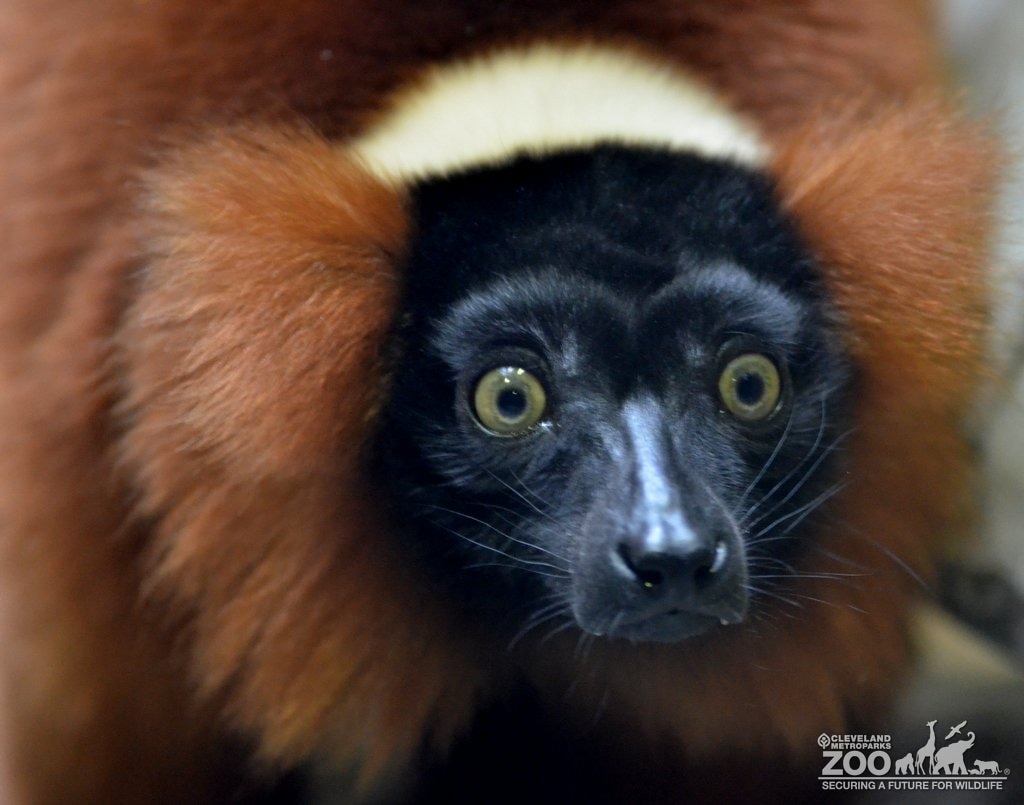 Extreme close-up of a red-ruffed lemur. Its black fur covered face fringed in red fur fills the frame.