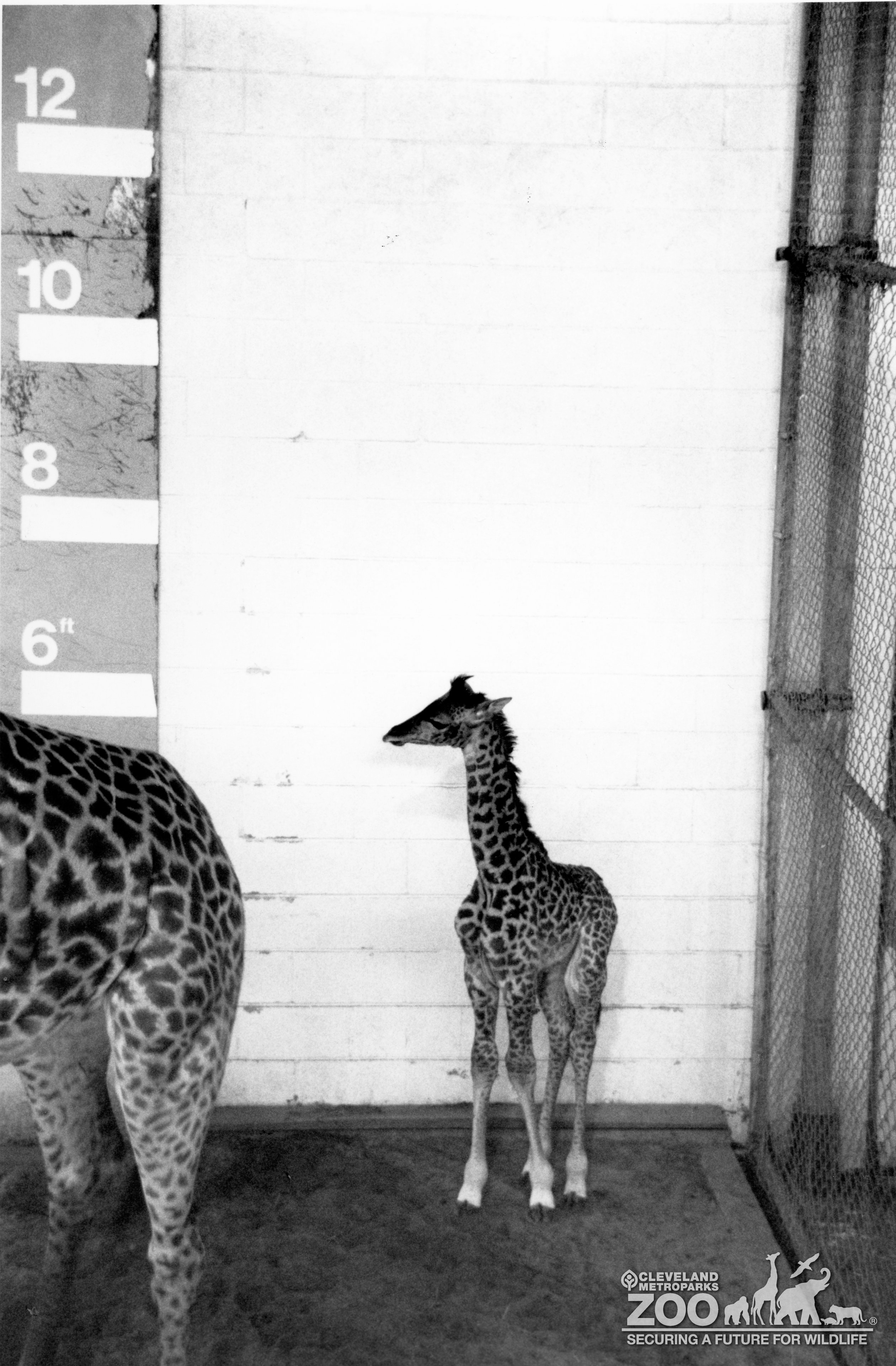 Black & white image of Masai giraffe infant standing at the back of the giraffe barn. Adult hind quarters are in view on the left side of the image.