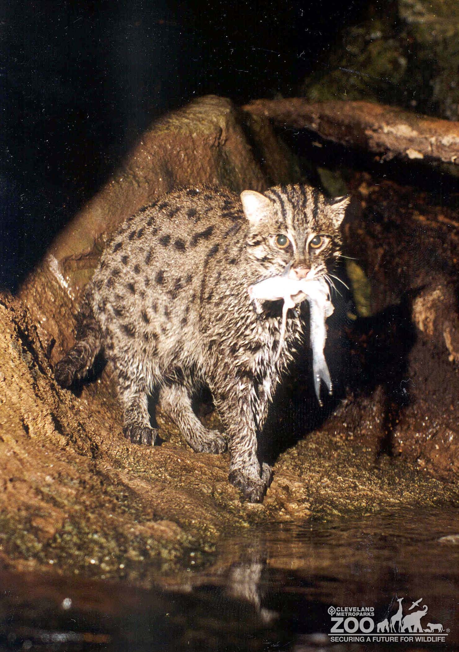Photo of Fishing Cat with a fish that it has caught. Cat is facing the camera.