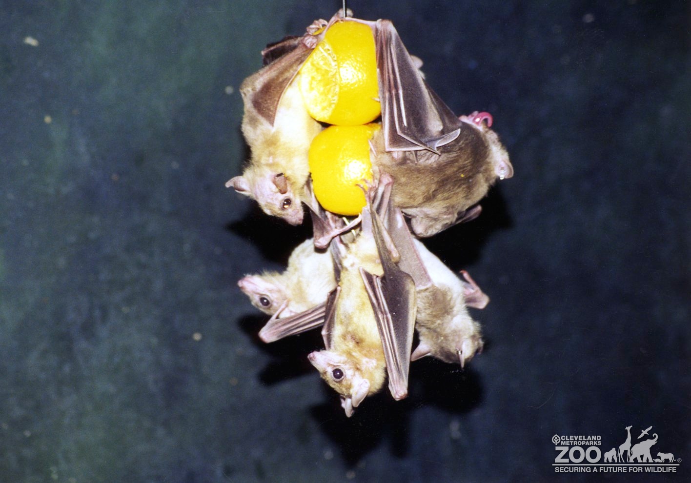 In this photo five Fruit Bats are crawling all over two yellow pears hanging from a tree branch. The bats looks similar to rodents with webbed wings and are covered in white fur with some tufts of brown fur on it's wing edges and face. Three of the bats are hanging from the bottom pear by their feet while the other two are climbing up the sides of both pears. Behind the bats there is a wall painted to look like a forest at night.