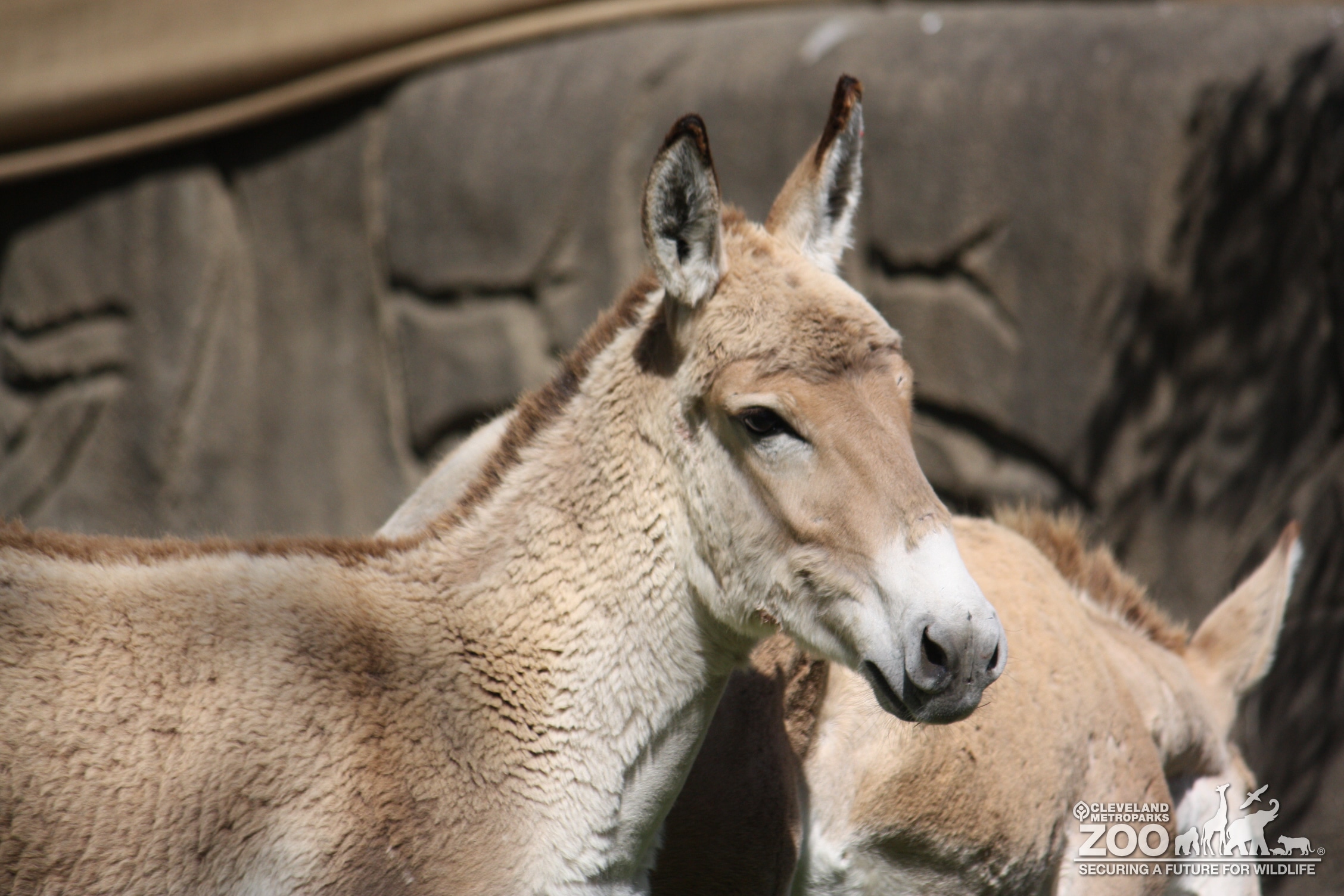 Persian onager shot of head. Animal looks like a dusty tan horse but has larger ears like a donkey. Equine is in outside habitat at Wilderness Trek.