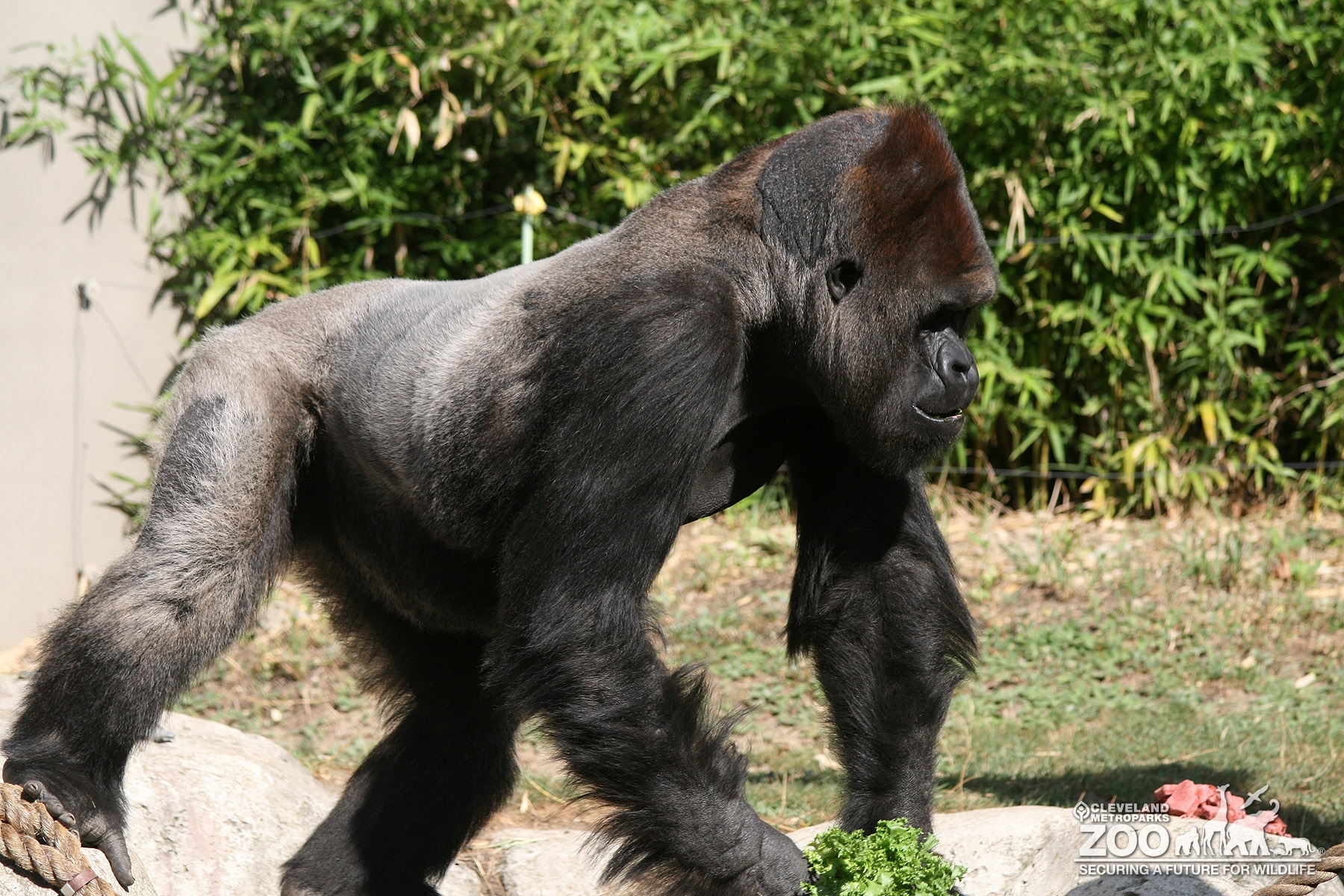 Gorilla walking with greens in its front hands. It is a side view of the animal and bamboo is growing in the background.