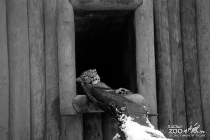 Black & white image of snow leopard looking out an opening in its habitat on a snowy day. Leopard is framed by large wooden poles that form a wall. Snow is on the log leading out of the opening for the leopard to climb.