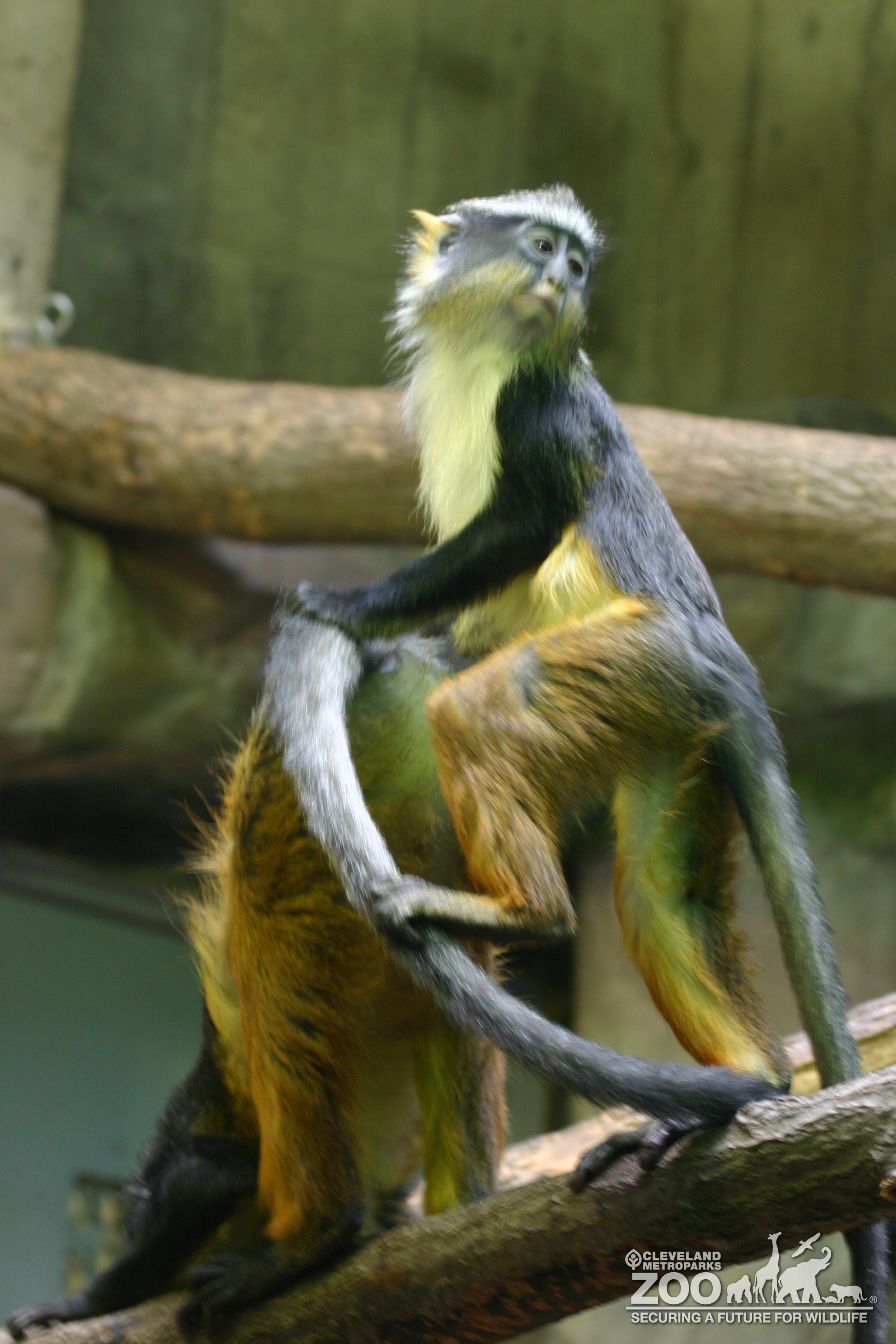 Pair of Wolf's guenon climbing exhibit branches. One is holding the base of the others tail. These tri-colored animals and slim bodies and long limbs.
