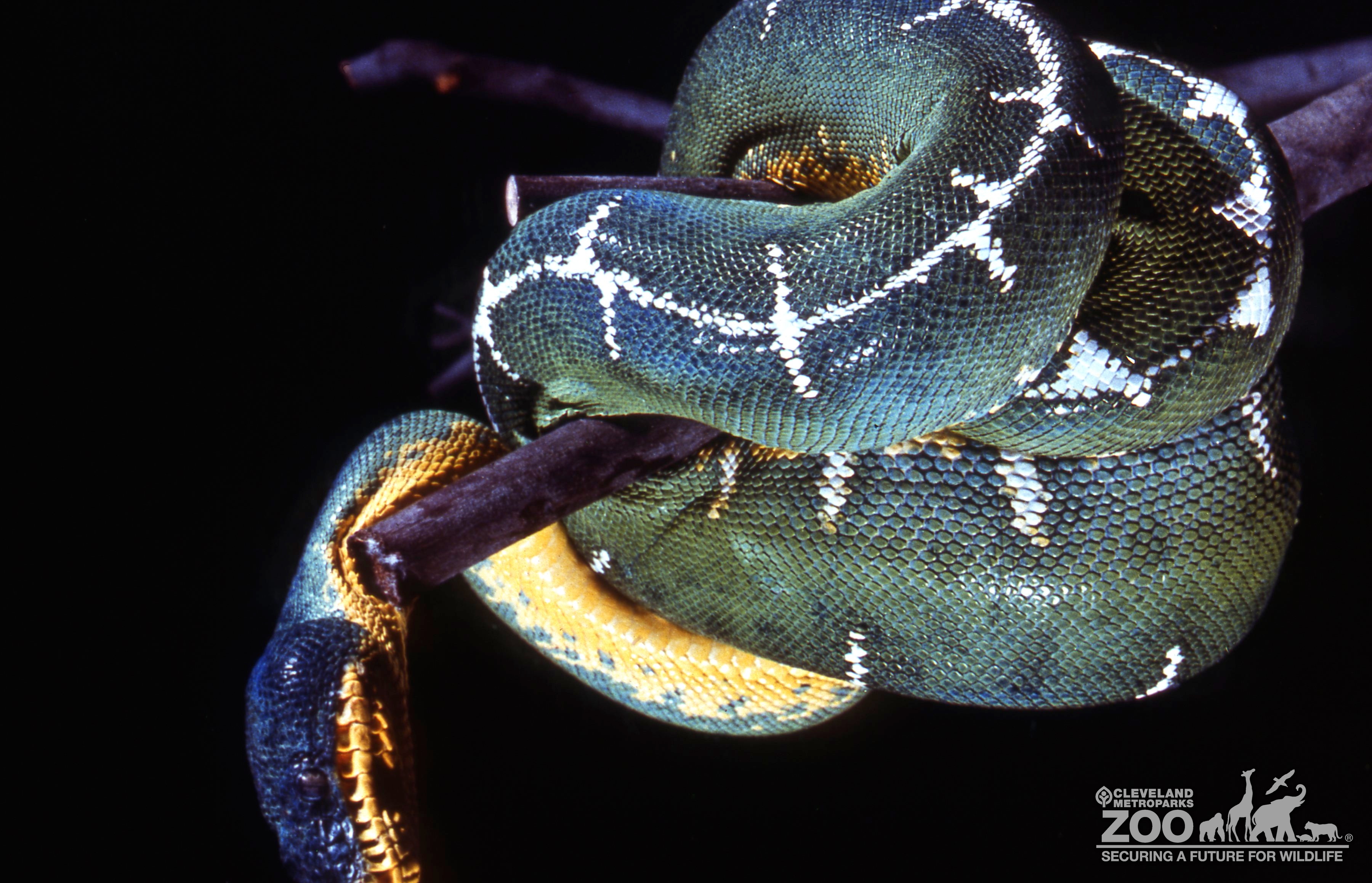 Close up photo of Emerald Tree Boa wrapped around a branch.