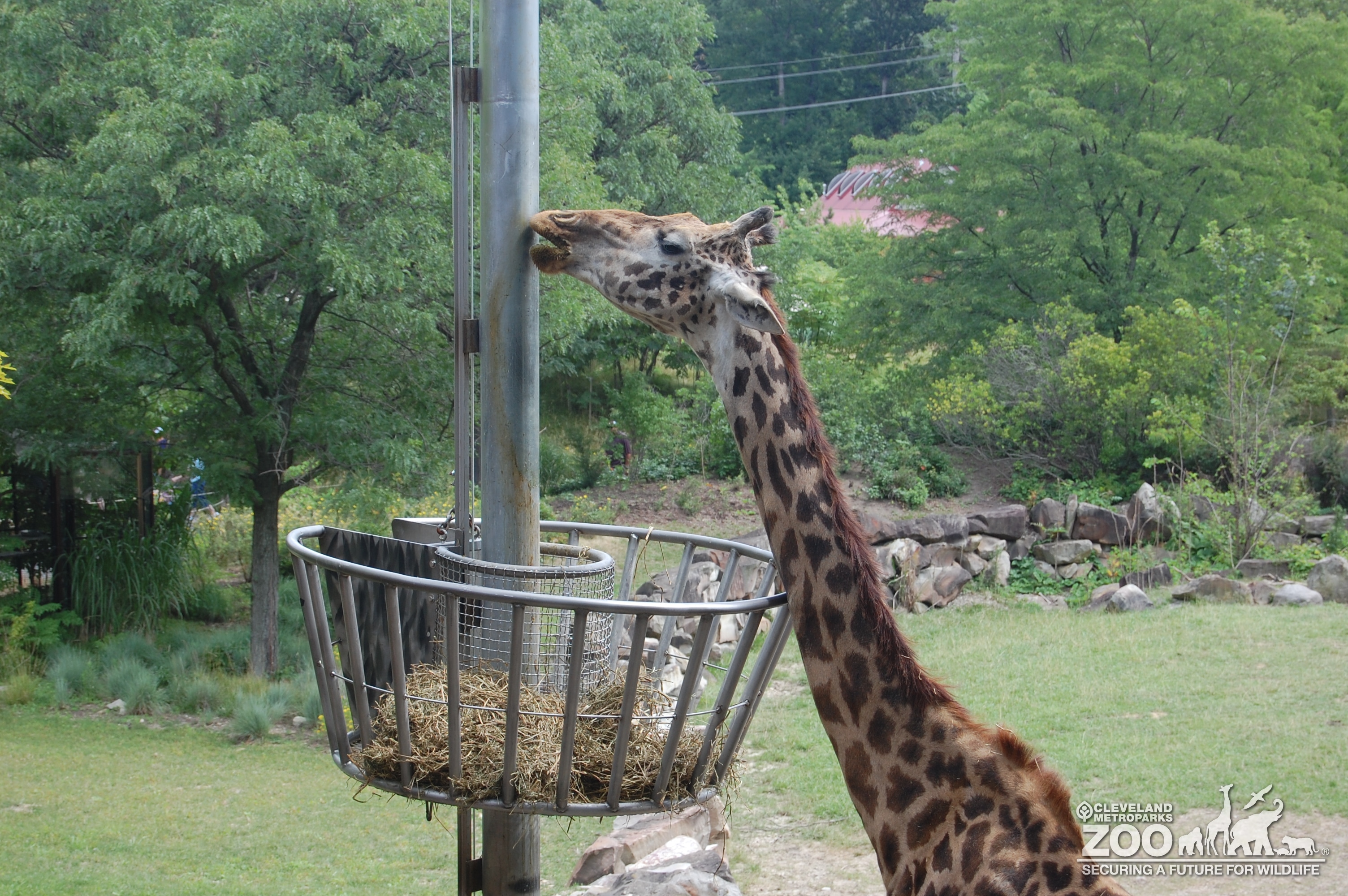 Adult giraffe is eating from an elevated feeder. The elevated feeder is a round gray metal basket that raised and lowed on a tall metal pole. The giraffe keepers put food in the basket and raises it so the giraffes can use their long necks to feed. The giraffe and feeder are located in the outside exhibit yard. There are leafy green trees and glimpses of zoo building in the background.