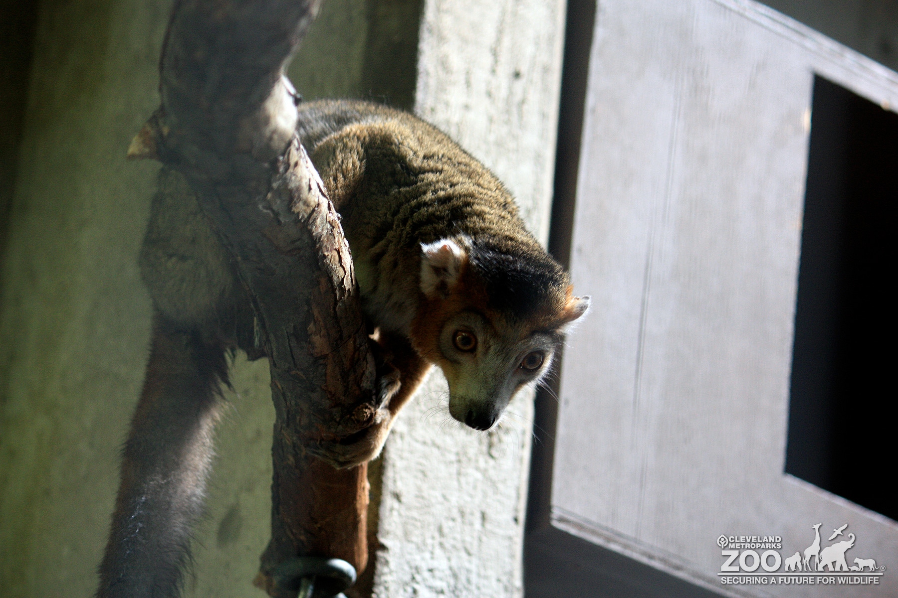 Crowned lemur sitting on a branch looking down from its perch. Gray nest box is in the shot to the side.