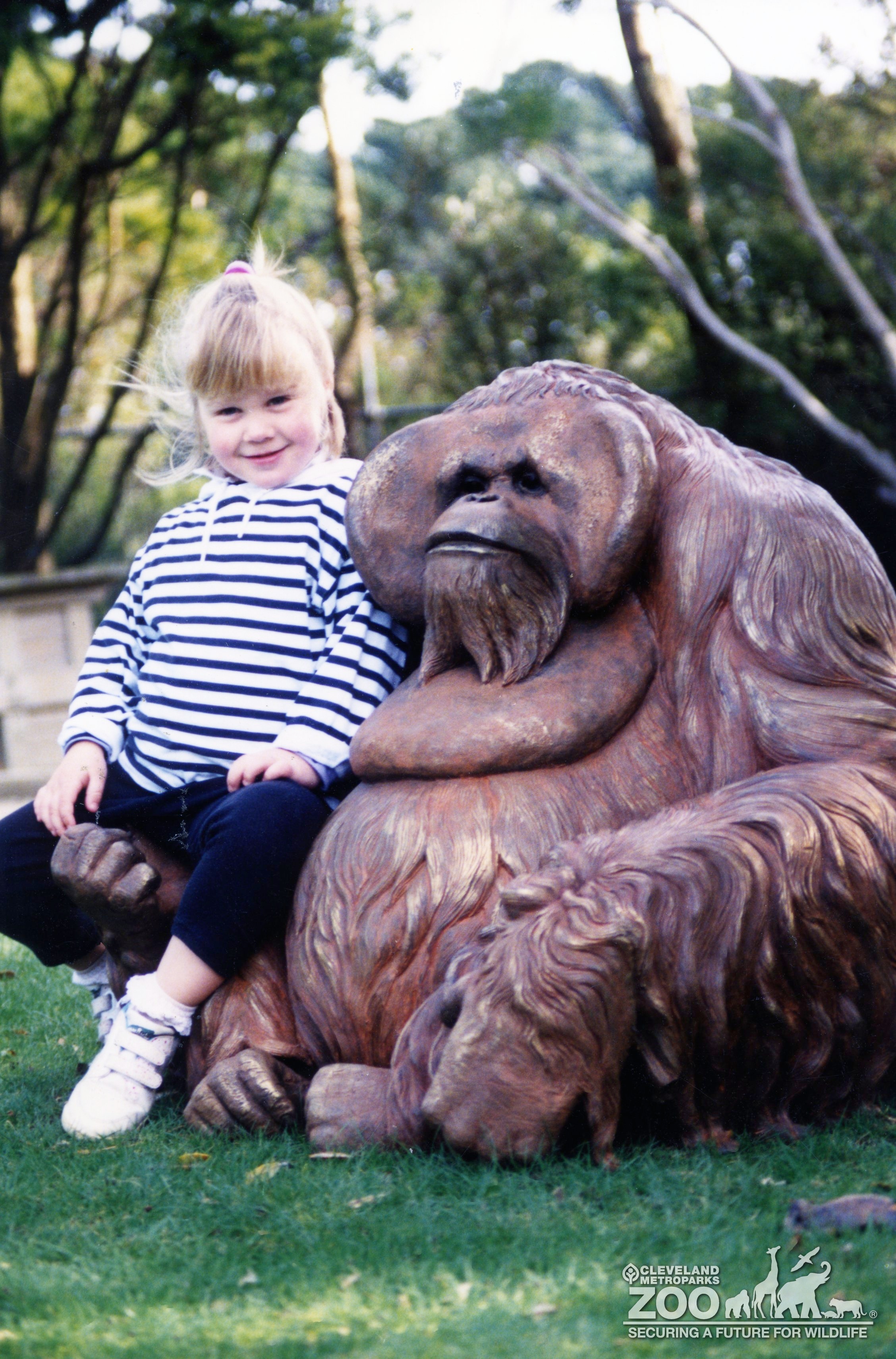Young girl sitting on the Orangutan sculpture that is on the path leading to the entrance of The RainForest. Green grass is a the base of the sculpture.