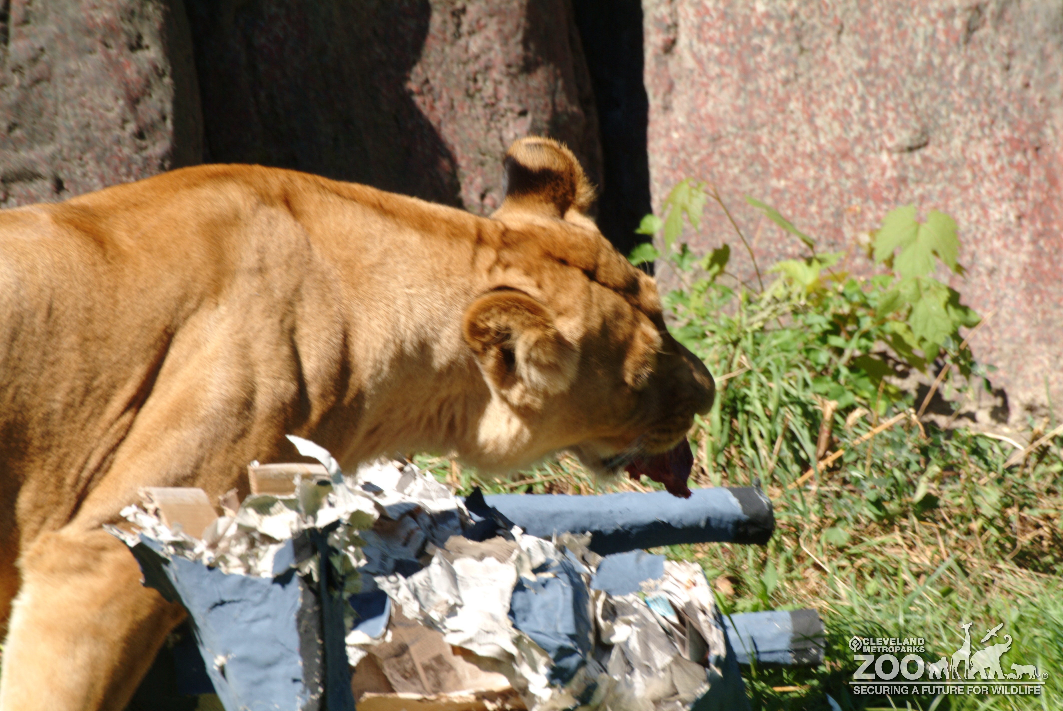 Lioness with shades of brown standing over torn gray and white paper mache gazelle enrichment item. Focus on top of lioness head turned toward camera and lioness shoulder and something in mouth.