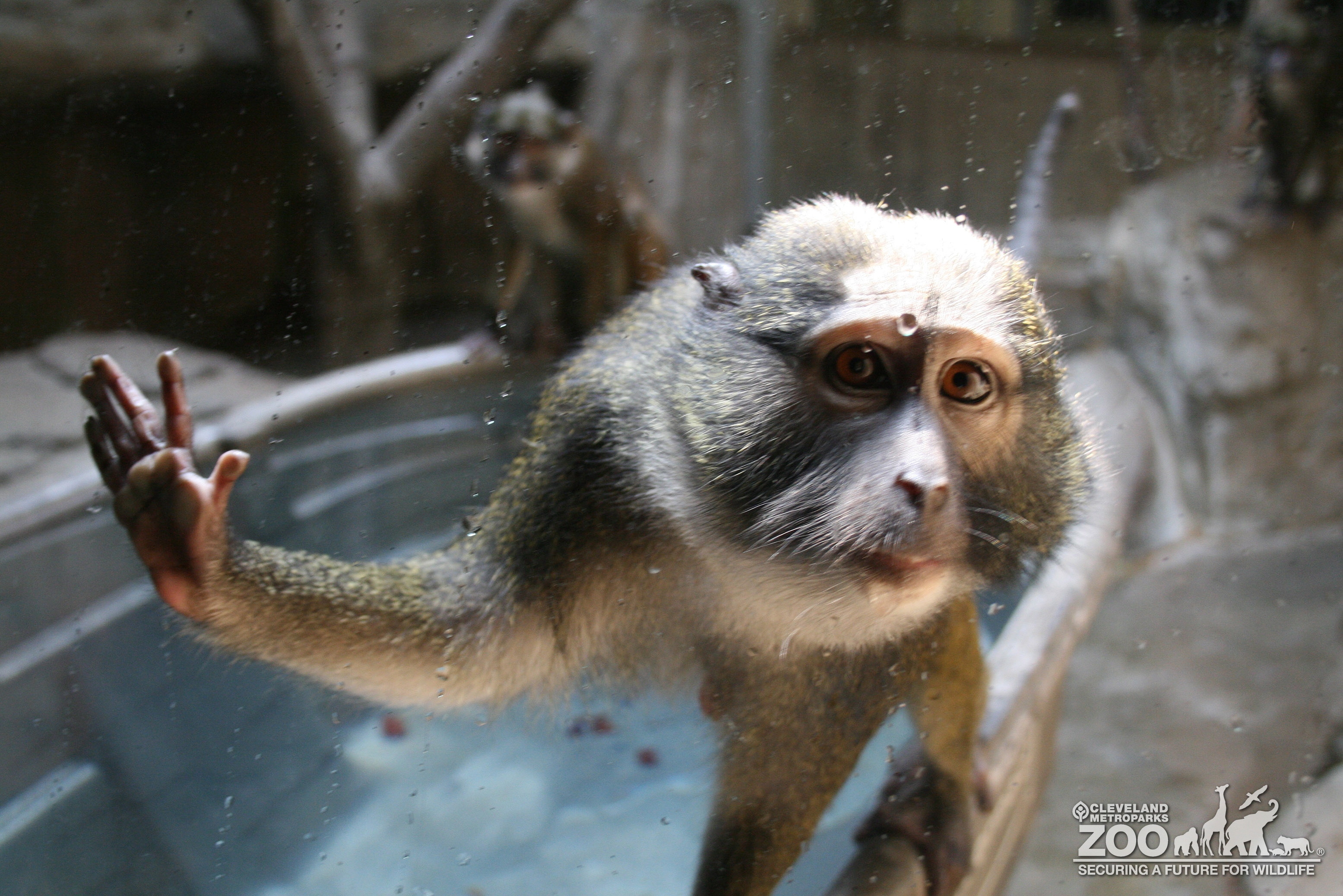 Allen's swamp monkey splash in its exhibit pool. It is balancing on the edge of this above ground gray tub. Other monkey is in the background. Its face is very close to the camera.