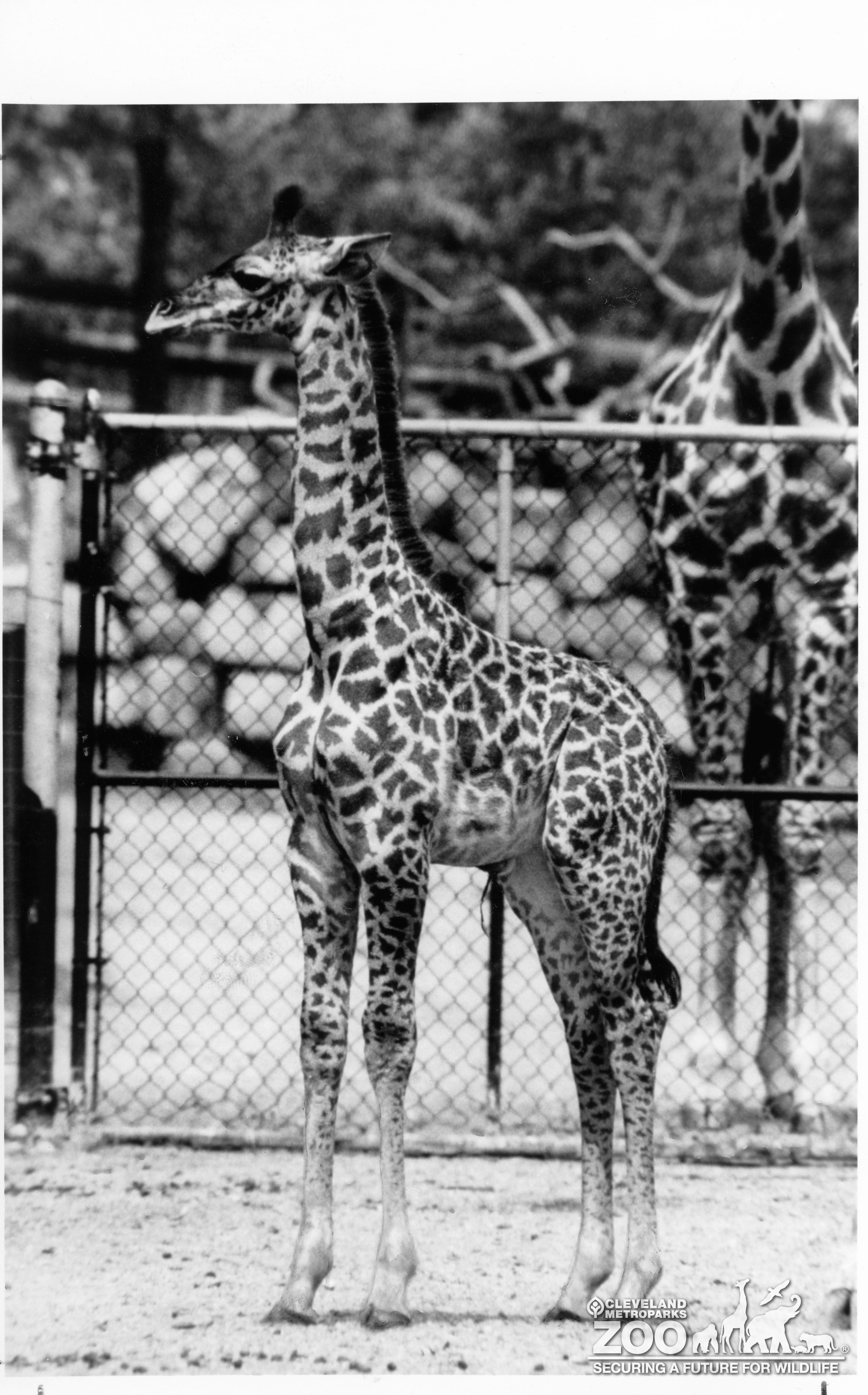 Black & white image of Masai giraffe infant viewed from the side. The young giraffe is standing in front of a chain link fence. Behind the fence is a large adult giraffe standing but you can only see it from its mid neck down.