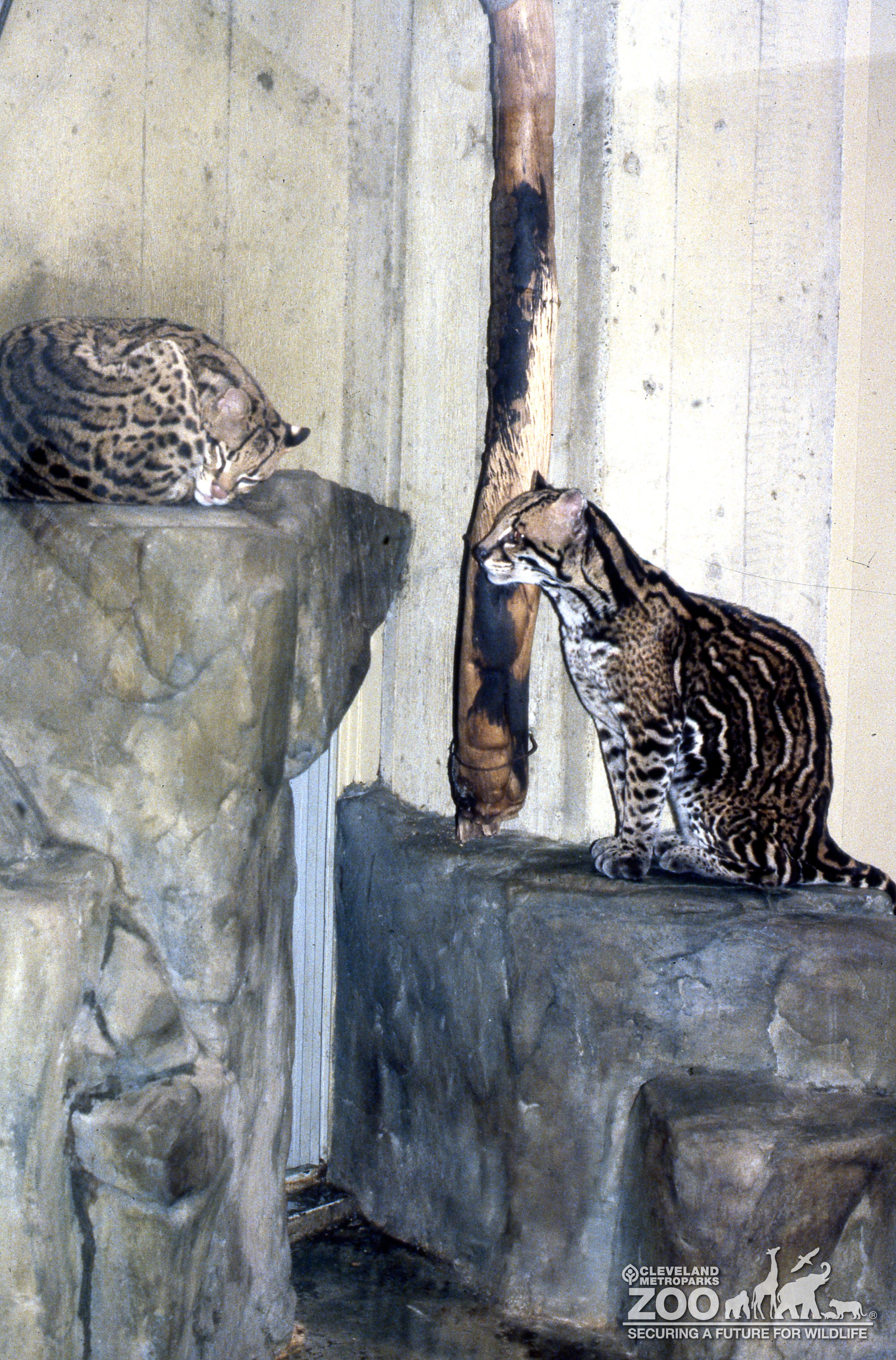 Pair of ocelots perched on rocks. One is curled up sleeping and the other is standing in profile looking up at the cat sleeping. There are in their indoor habitat.