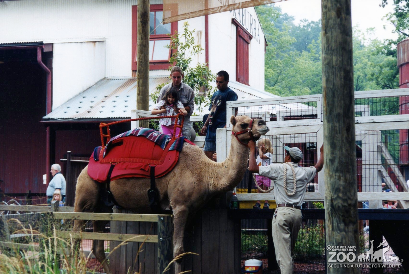 A photo of a youth girl climbing on of the Zoo's camels with the assistance of a Zoo staff member. The camel is covered in short brown fur with a single hump on its back. It has a large red saddle strapped to its back from young guests to ride. In the background is the wooden platform where guests wait to ride the camel and the large red and white barn where the animals from the Zoo's Contact Yard are housed.