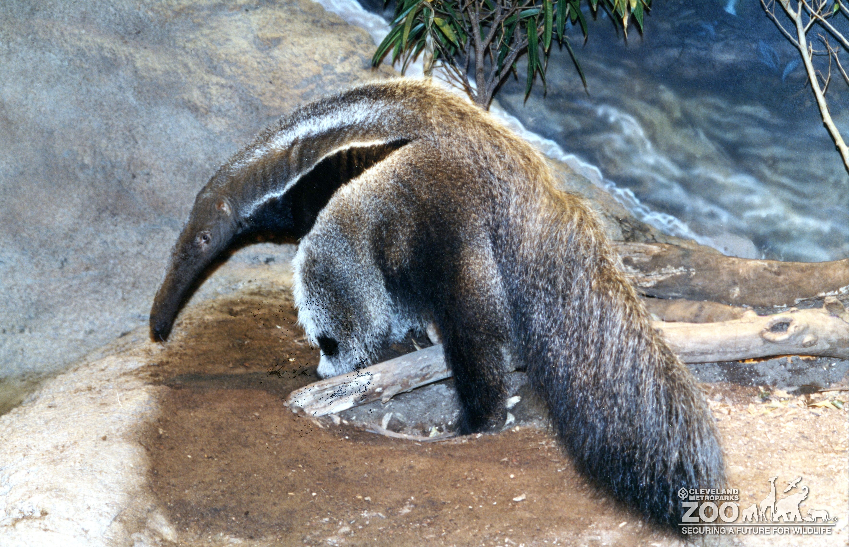 This Anteater is covered in gray fur from it's snout to it's tail, it has a white fur on it's front legs with a white stripe on the side of it's neck, and the fur on the underside of it's neck is black. It is standing in it's enclosure, faced away from the camera, on a mound of sandy brown ground with a large tree branch laying across it. The background of the enclosure is a painting of a water feature that connects to a large rock that juts out from the painted background.