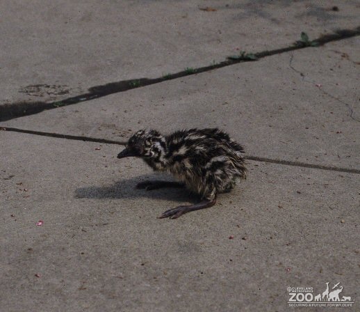 Emu chick on cement ground. Emu chick is slightly striped with black and white and in profile looking left. Legs are bent as the chick squats on the ground.