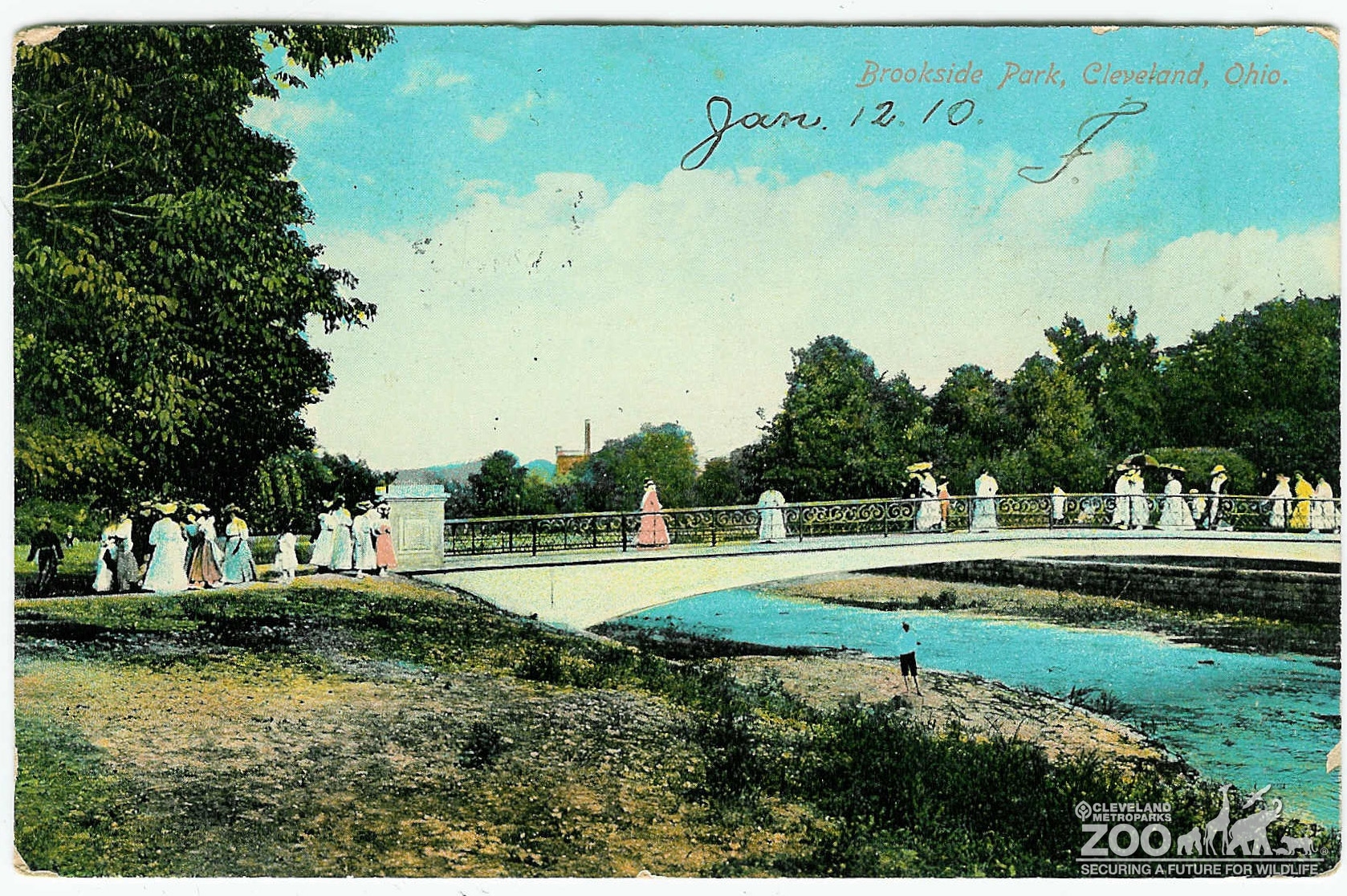 This Postcard reads Brookside Park, Cleveland, Ohio. There is a handwritten note that reads Jan 12, '10, F. This image shows people crossing a bride over a river. Many in dresses. A small green hill is in the foreground.